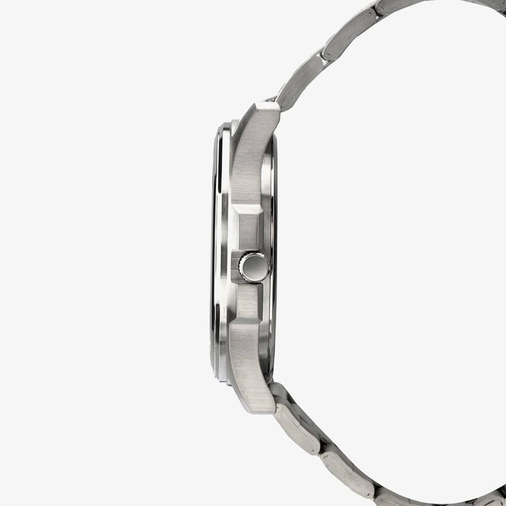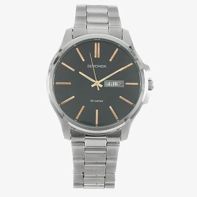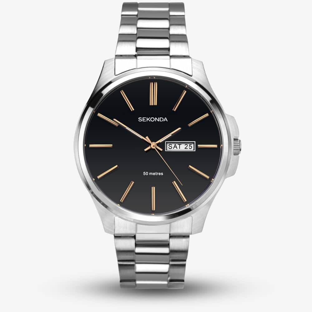 This sophisticated gents watch from Sekonda combines a round brushed stainless steel case with a brushed and polished bracelet, solid dial and day/date window at 3. Rose gold batons serve as hour indices to match the slim hands, the hour and minutes of which are inlaid with luminescent material.