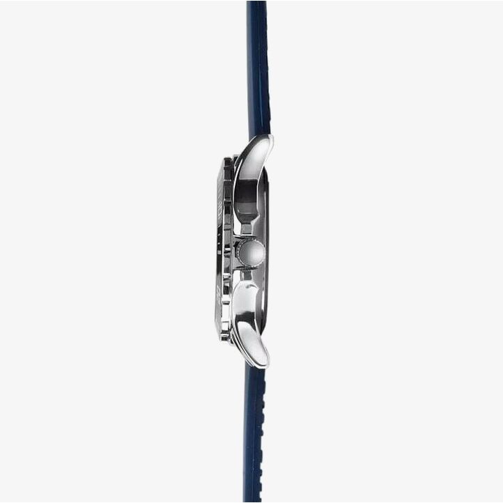 This sleek watch features a vibrant blue rubber dial and a matching blue bezel, offering a bold and modern aesthetic that stands out with confidence. The contrasting grey dial serves as a sophisticated backdrop, adorned with white and blue indices and hands that ensure optimal legibility in any lighting condition.