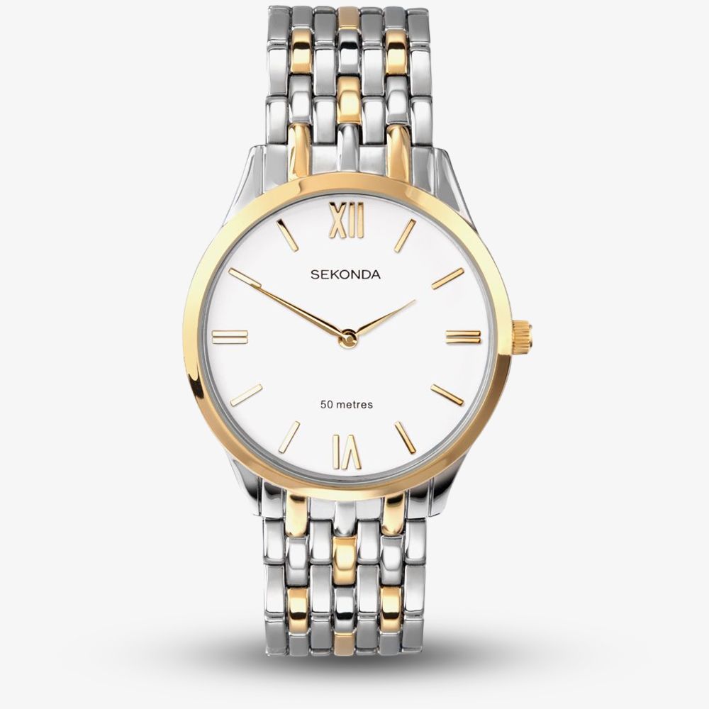 This exquisite watch features a radiant gold case and a striking two colour silver and gold bracelet. The opulent gold case exudes elegance and sophistication, while the dual-tone bracelet adds a touch of versatility, seamlessly blending with both gold and silver accessories in your collection.