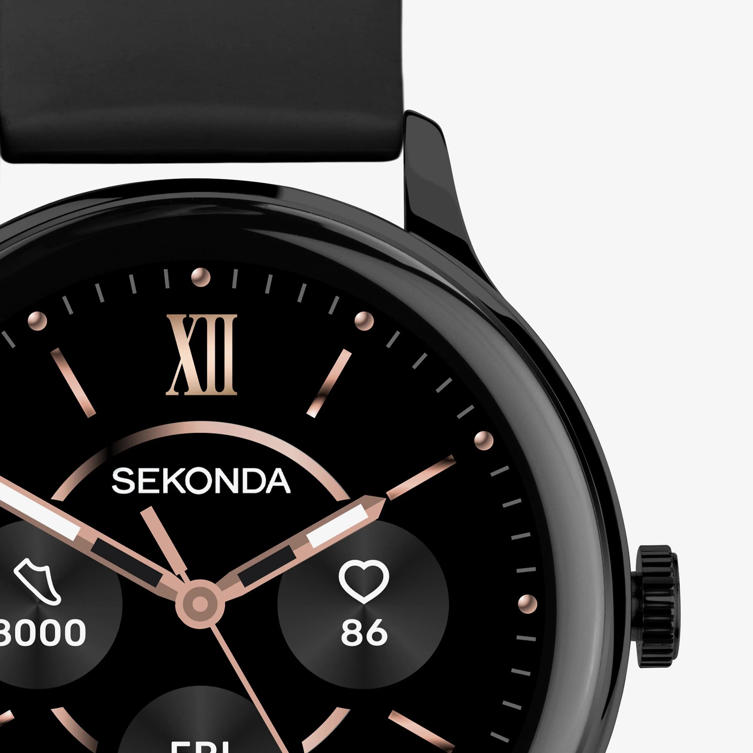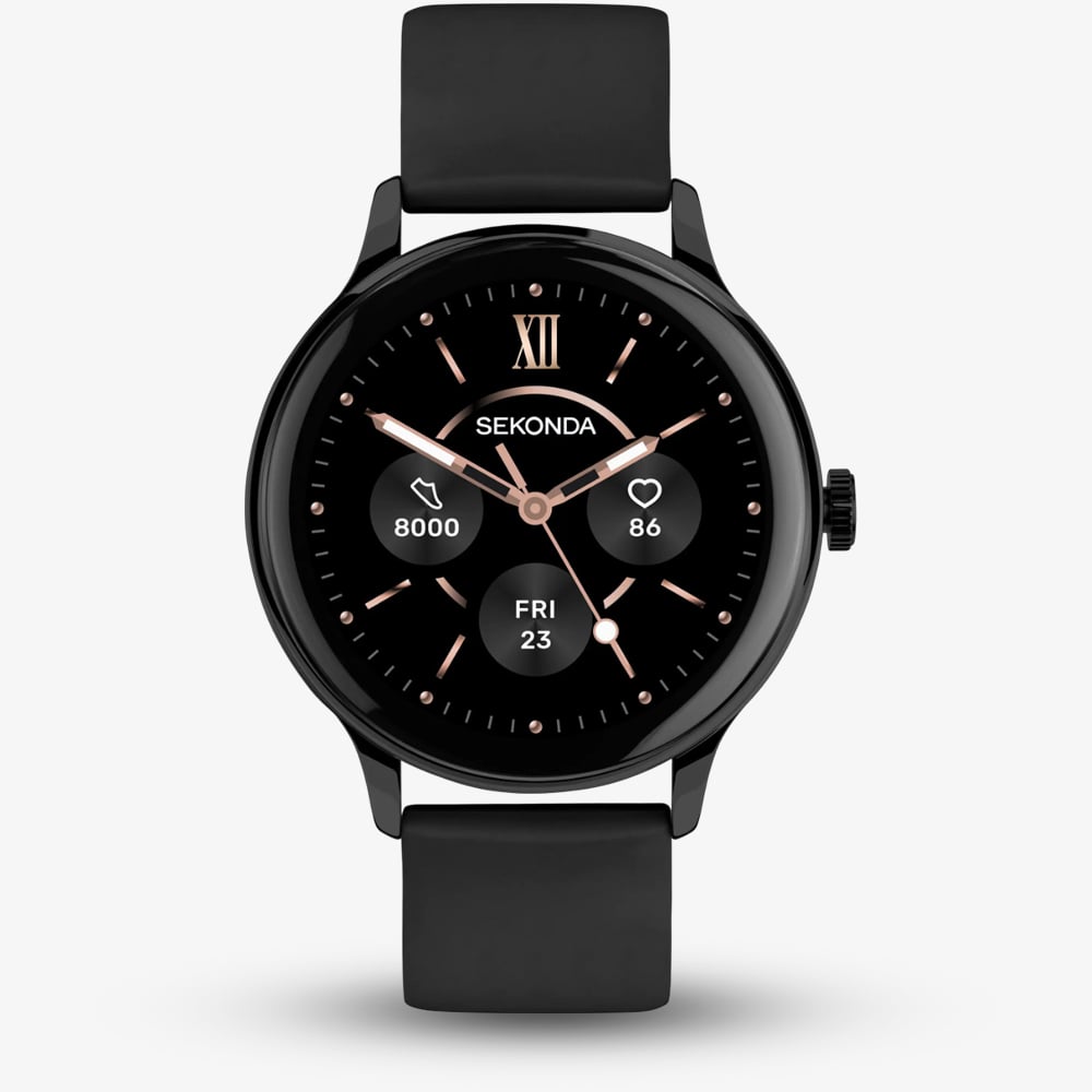 This stunning smartwatch, finished in bold black, is designed to complement your lifestyle, keeping you connected and active. A beautiful rose gold finish lends a touch of luxury to your everyday wear, making this smartwatch a stylish accessory. Monitor your daily steps, track your sleep patterns, and keep a close eye on your heart rate for a healthier you. Receive instant notifications for calls, messages, and social media alerts directly on your wrist, ensuring you never miss a beat. Manage your music playback and remotely control your phone's camera, all from the convenience of your wrist.