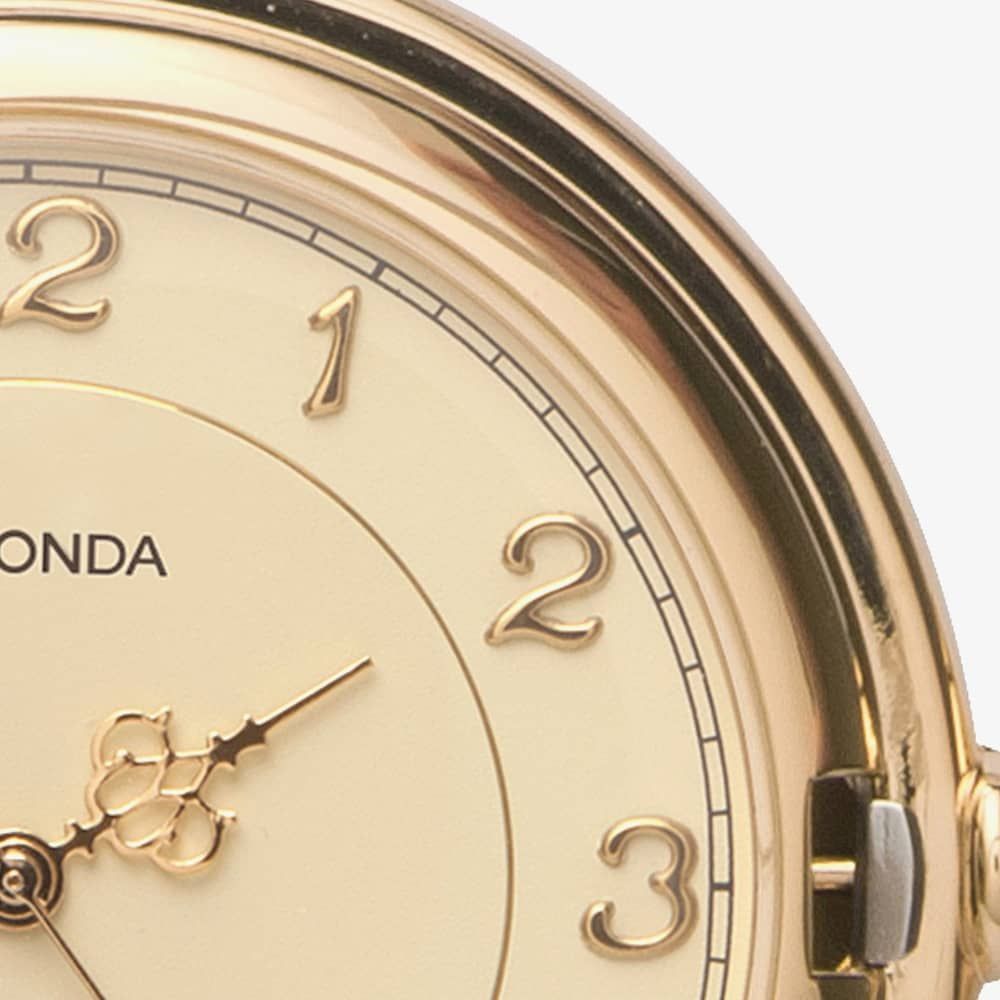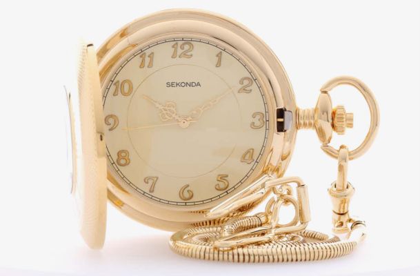 This watch showcases a circular case plated in gold, accompanied by a hinged lid that encases a cream-colored dial adorned with Arabic numerals in gilt. The ensemble is finished with a unique gold-plated fob chain.
