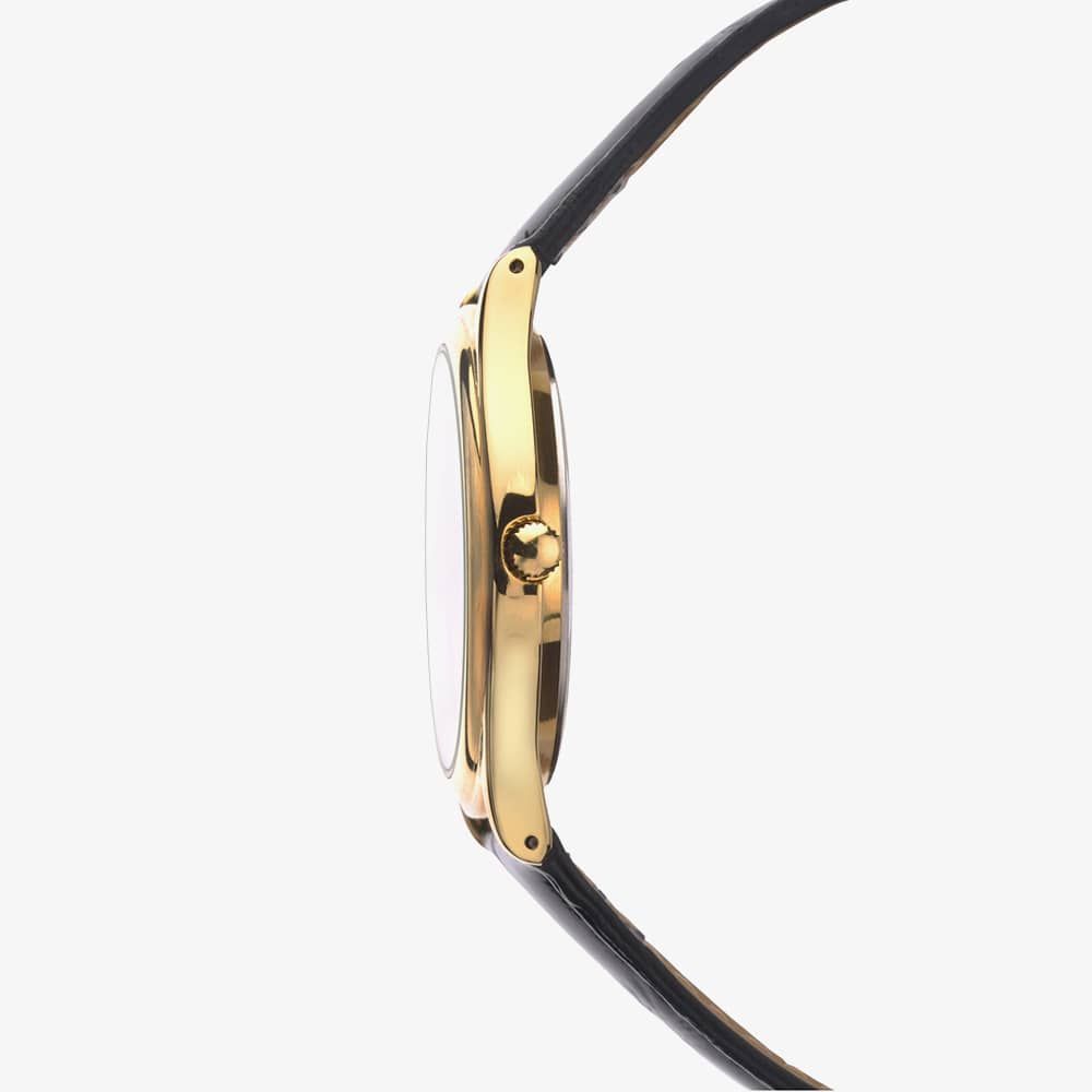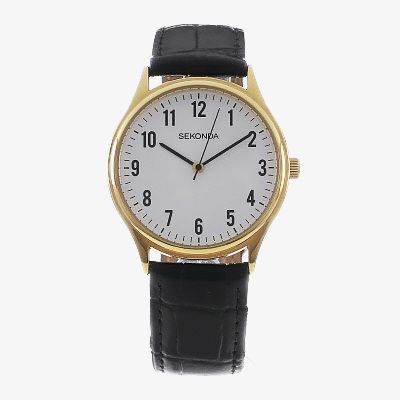 A classically styled mens timepiece from Sekonda which features a gold tone case surrounding the white dial with Arabic numeral hour markers and black hands. Fastens comfortably using a black genuine leather strap.