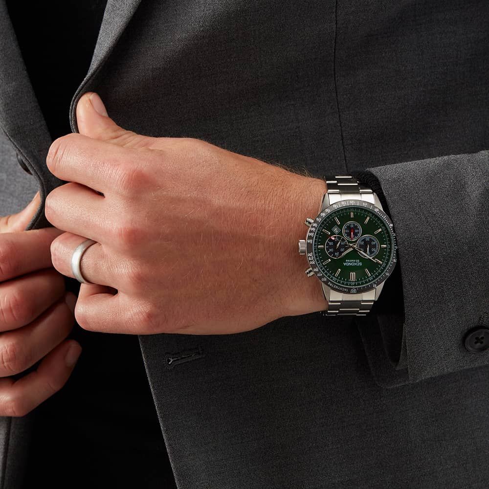 Crafted with meticulous attention to detail, its stainless steel construction exudes durability and sophistication. Featuring a striking green dial, this timepiece adds a bold pop of color to any ensemble, while the chronograph functionality ensures precise timekeeping and versatility. This watch effortlessly combines functionality with a touch of modern elegance, making it the ultimate accessory for the discerning gentleman.