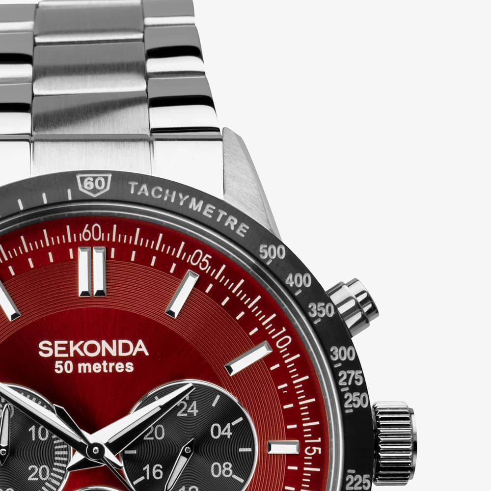 This timepiece combines classic elegance with a contemporary twist, making it a standout accessory for the modern gentleman. The silver-tone case and bracelet exude timeless style, while the vibrant red dial adds a pop of color and personality. Perfect for both formal occasions and everyday wear, this watch effortlessly commands attention and makes a bold statement.