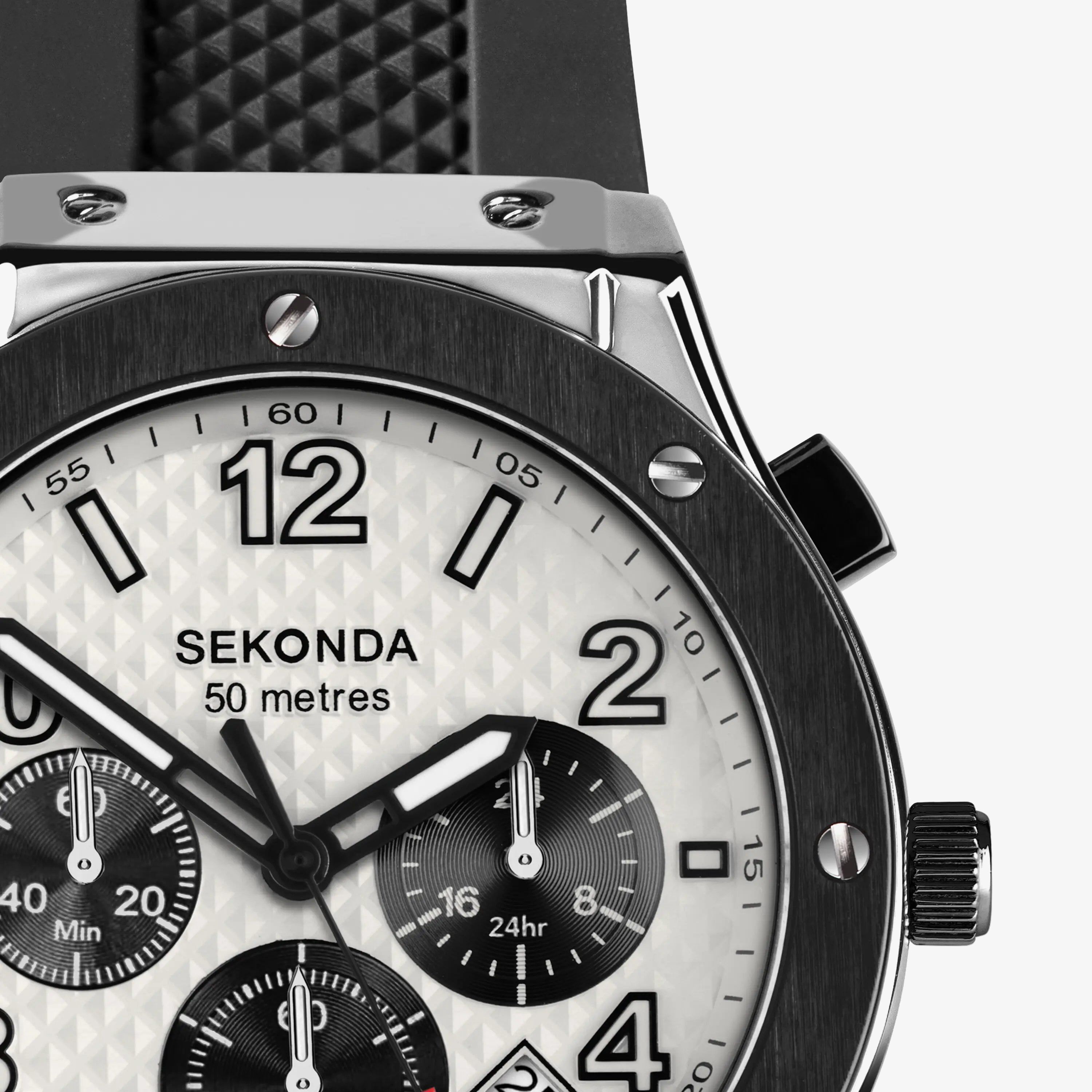 a dynamic and functional timepiece designed for the modern man. It combines a striking white dial with the added complexity of a chronograph, offering both style and precision. This watch is built for those who demand performance and appreciate a bold, contemporary aesthetic.