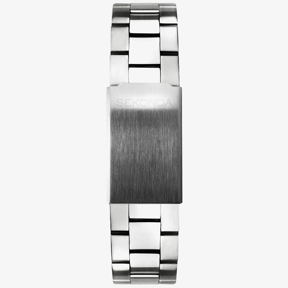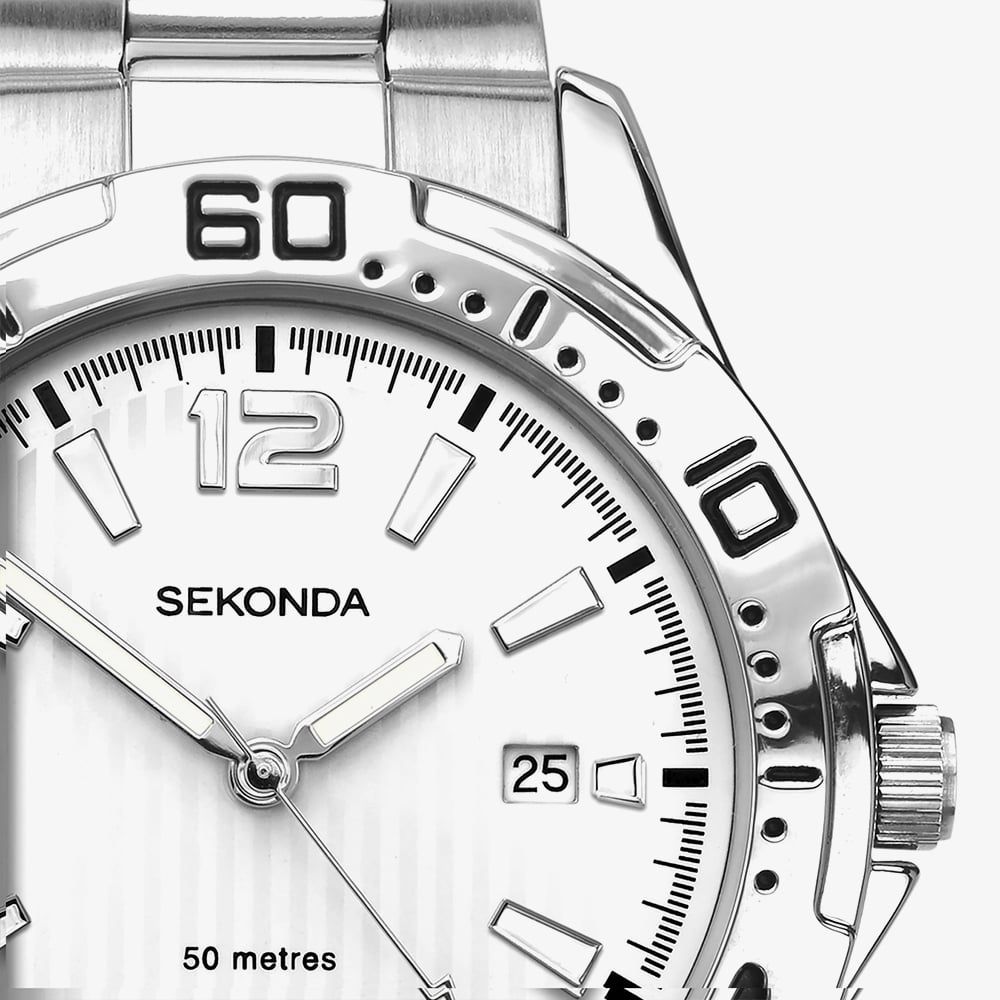 Sekonda brings practical refinement to everyday wear with the 1169 model, a timepiece shaped by clean lines and reassuring solidity. Its 44mm case is crafted from a smooth silver metal alloy that feels cool to the touch, paired with a stainless steel bracelet that settles comfortably against the wrist with its secure fold over clasp. The white dial offers crisp legibility, with Arabic numerals and baton markers complemented by softly luminescent hands for clarity in changing light.