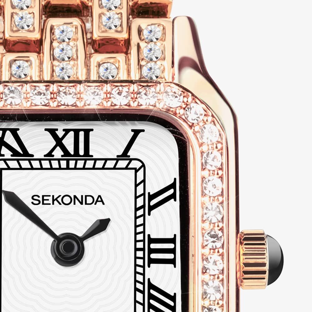 This watch is crafted in rose gold plated metal alloy, featuring a bezel adorned with stones and a white dial. It is secured with a fully stone-set, rose gold plated alloy bracelet.