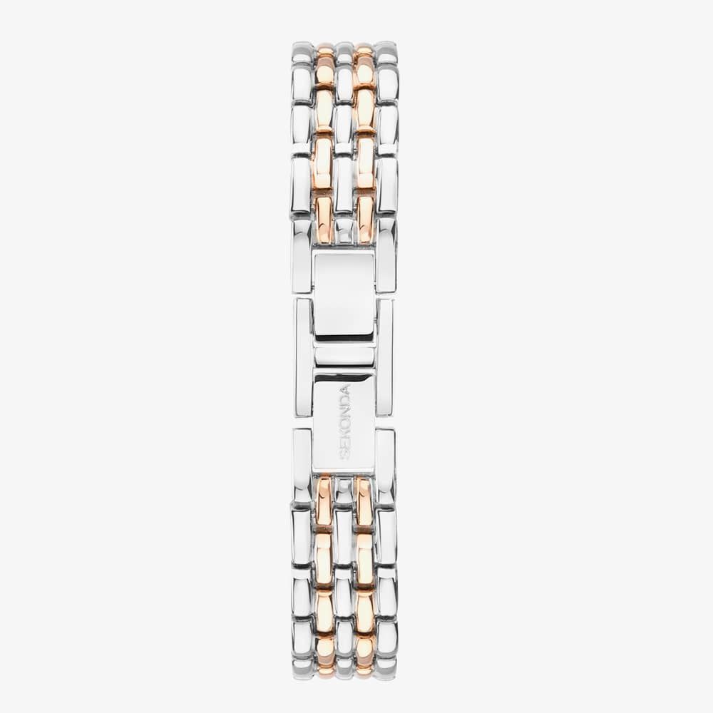 This captivating square dial watch is adorned with 48 glistening crystals on the bezel. The rose gold plated finish with the silver tones adds a touch of opulence, making this watch the perfect accessory for both formal occasions and everyday wear.