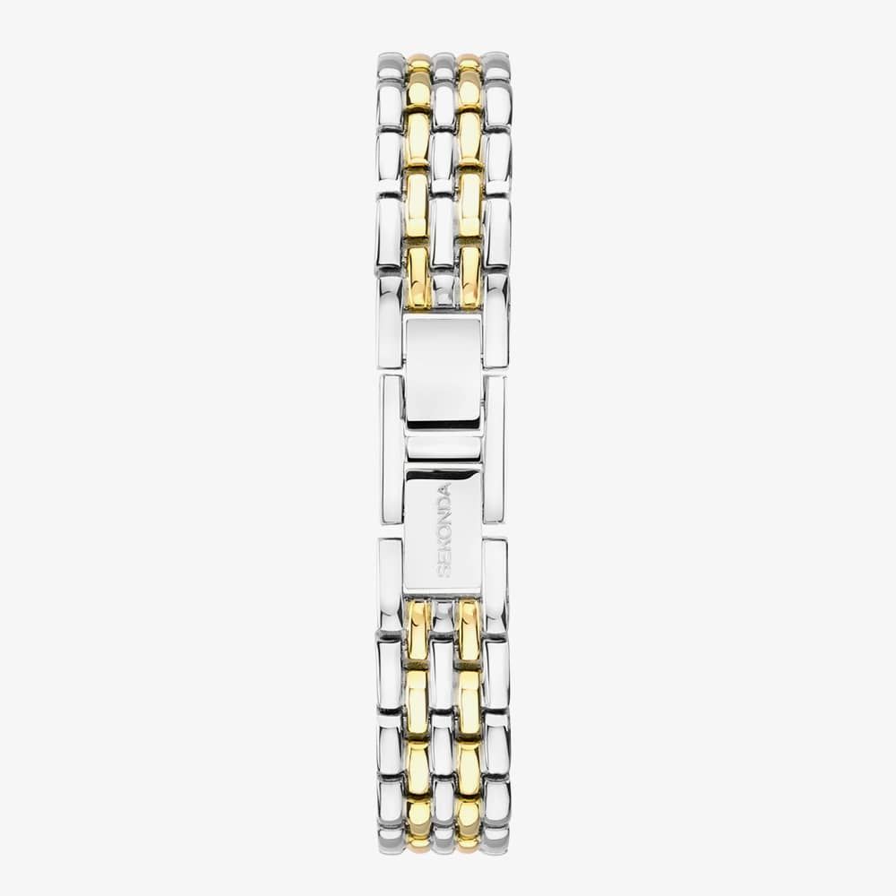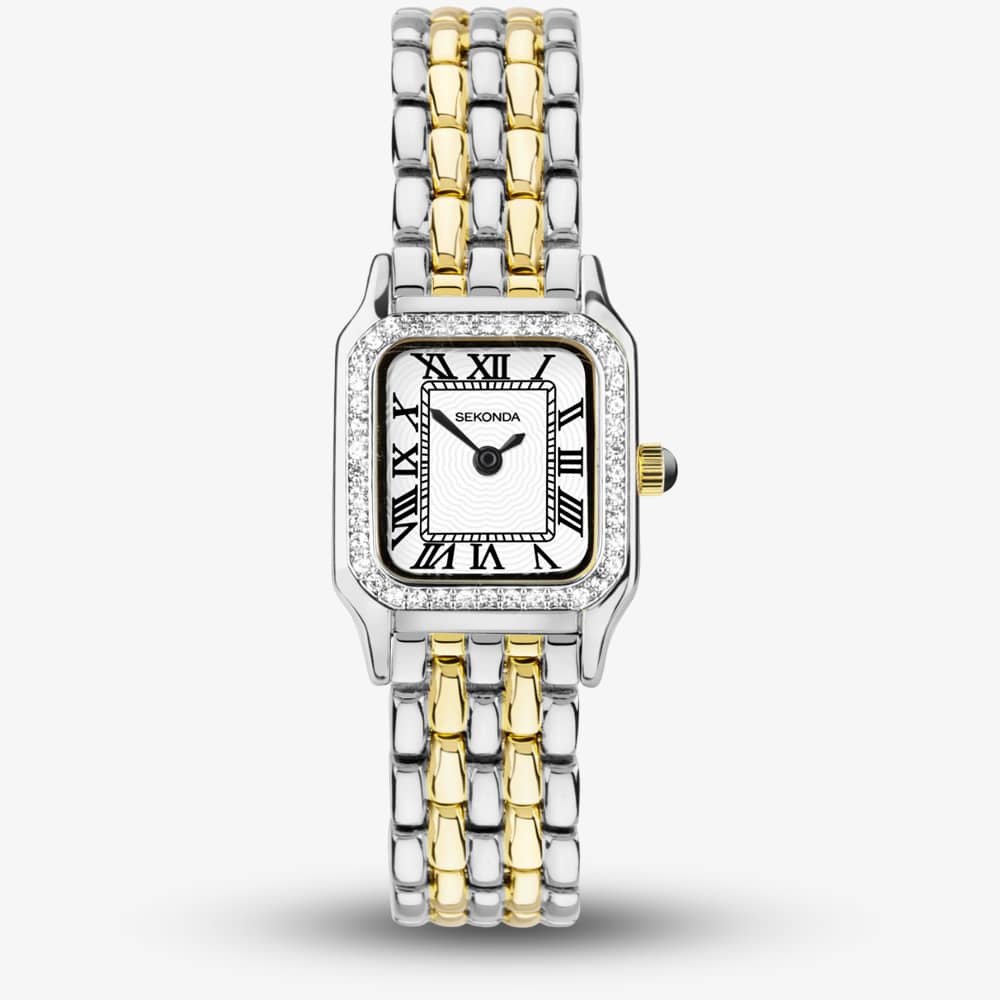 This captivating square dial watch is adorned with 48 glistening crystals on the bezel. This exquisite timepiece effortlessly combines the timeless allure of gold and silver tones, offering a versatile accessory that complements any attire.