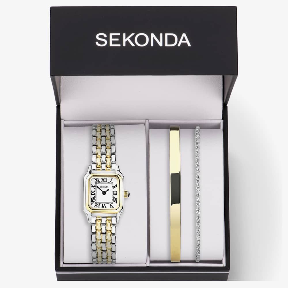 This exquisite set features a sophisticated two-colour ladies' watch as its centrepiece, adorned with a blend of silver and gold tones, making it a timeless accessory suitable for any occasion. The watch is complemented by a matching silver stainless steel rope bracelet and a beautifully crafted gold-plated copper bangle, adding a luxurious and stylish accent to the overall look.