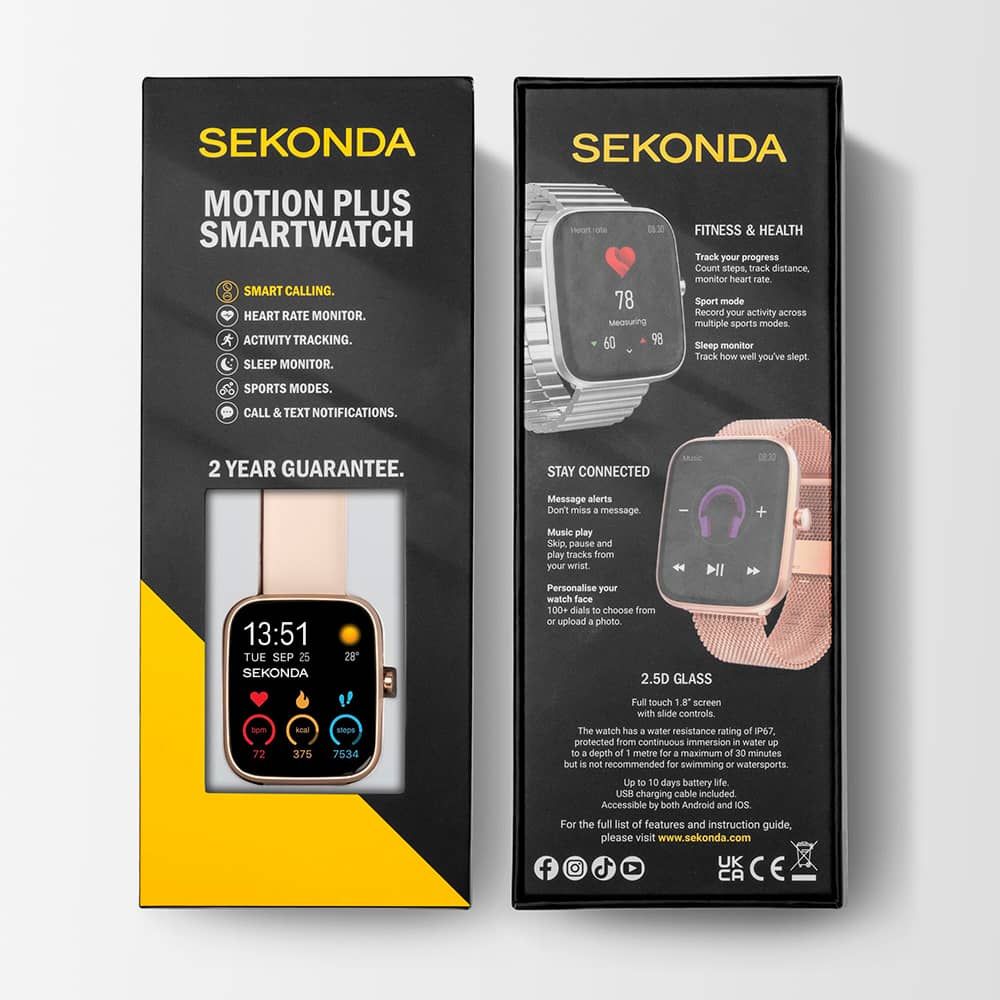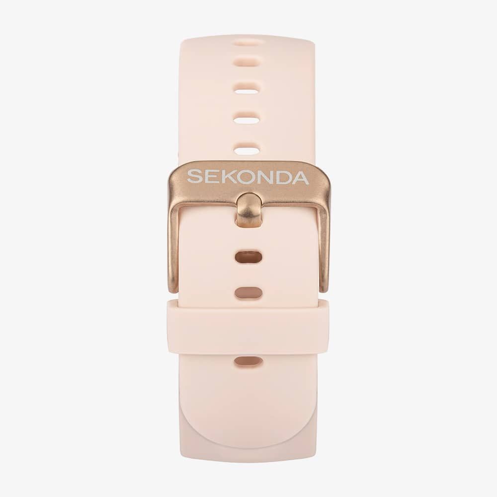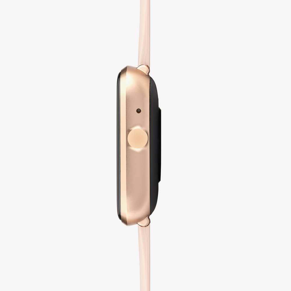 This watch boasts a rose gold ion-plated alloy case and a 1.83-inch rectangular fully interactive touch screen. Its features include a step, distance, and calorie tracker, along with 15 sports modes, blood oxygen monitoring, Bluetooth calling, the ability to set frequent contacts, and the option to accept, reject, or dial calls directly from your watch. Fastened with an interchangeable pink silicone strap equipped with quick-release spring bars, this watch has a water resistance rating of IP67, making it splashproof and showerproof, but not suitable for swimming or water sports.
