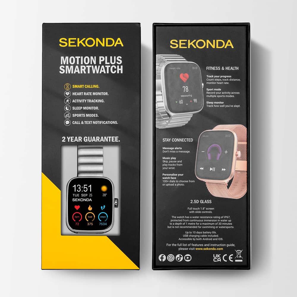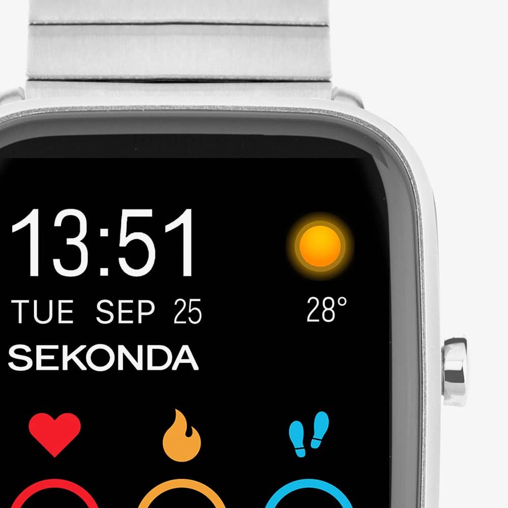 This watch features a silver ion-plated alloy case with a 1.83-inch rectangular fully interactive touch screen. It comes equipped with a step, distance, and calorie tracker, along with 15 sports modes, blood oxygen monitoring, Bluetooth calling, the ability to set frequent contacts, and the option to accept, reject, or dial calls directly from your watch. The watch is fastened with an interchangeable silver ion-plated stainless-steel bamboo-style bracelet, complete with quick-release spring bars. With a water resistance rating of IP67, it's splashproof and showerproof, but not recommended for swimming or water sports.