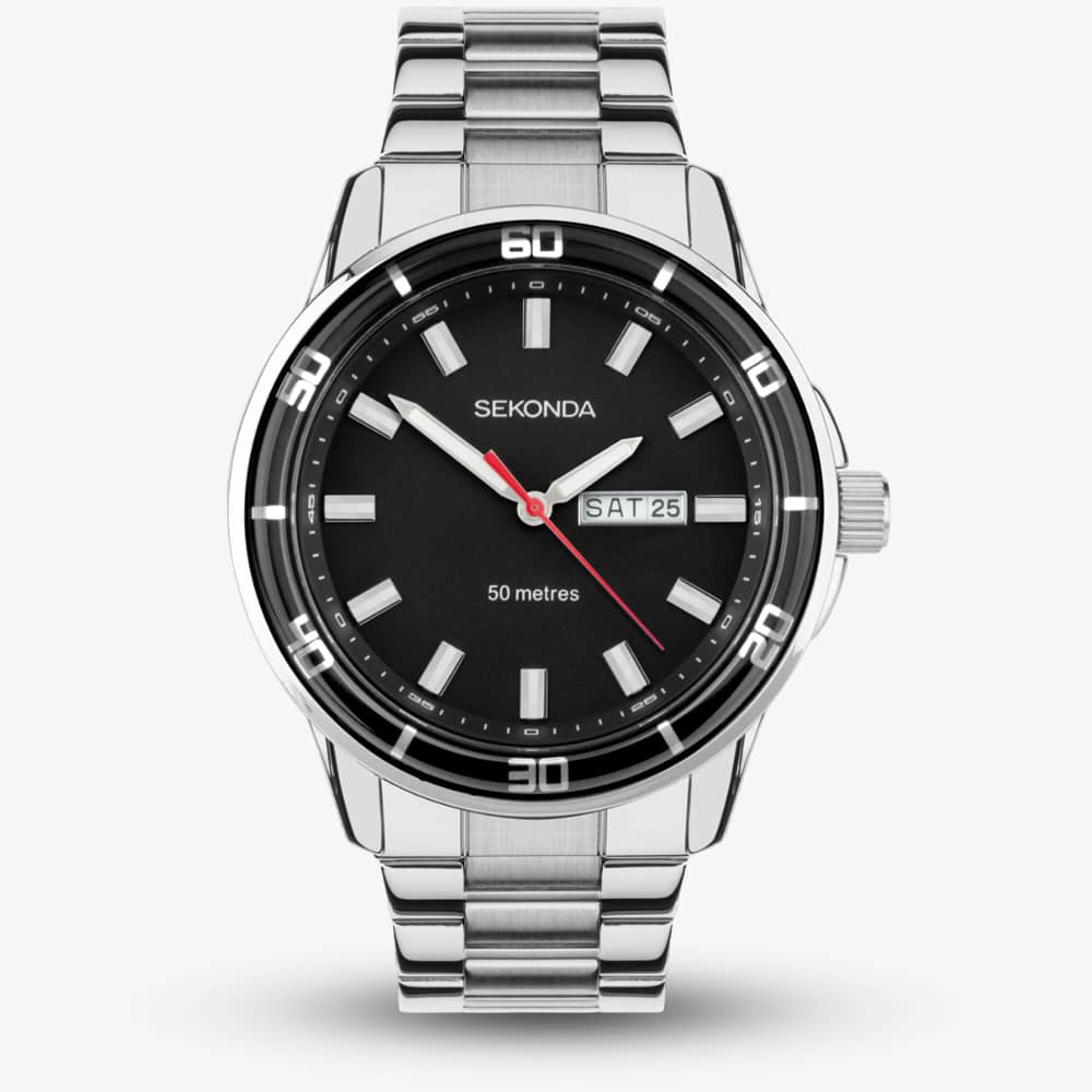 This sleek men's watch boasts a round ion-plated silver alloy case with a bold black dial featuring a chapter ring, adding a touch of sophistication to any ensemble.