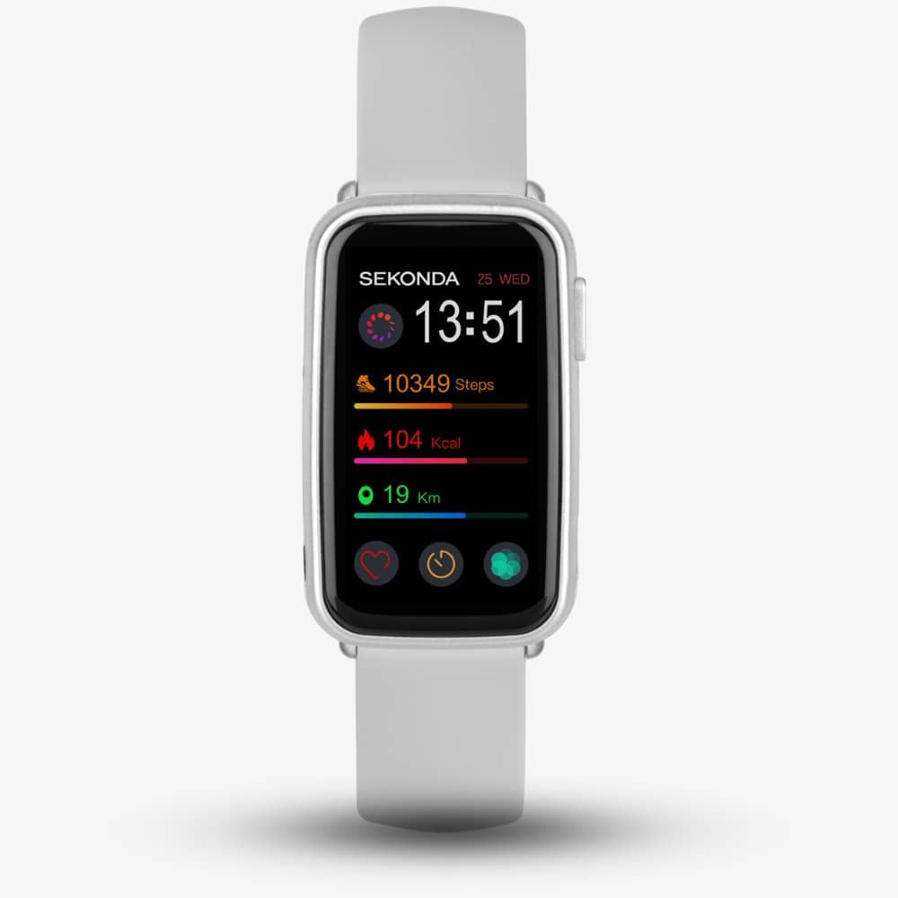 This watch comes with a silver-grey plastic case and a 1.47-inch rectangular fully interactive touch screen. Its features include a step, distance, and calorie tracker, along with 8 sports modes, heart rate and blood oxygen monitors, and message notifications. Fastened with an interchangeable grey silicone strap equipped with quick-release spring bars, this watch has a water resistance rating of IP68, making it splashproof and showerproof, though not suitable for swimming or water sports.