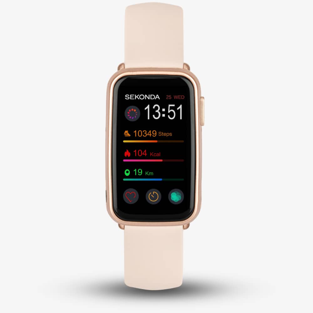 This watch features a rose gold plastic case with a 1.47-inch rectangular fully interactive touch screen. Its features include a step, distance, and calorie tracker, along with 8 sports modes, heart rate and blood oxygen monitors, and message notifications. The watch is fastened with an interchangeable pink silicone strap equipped with quick-release spring bars and has a water resistance rating of IP68, making it splashproof and showerproof, but not suitable for swimming or water sports.