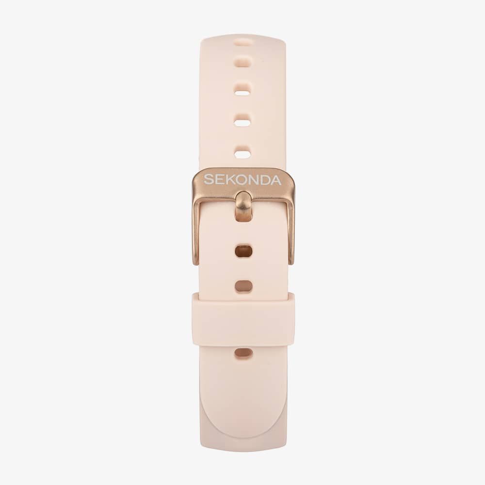 • Presented on a pink rubber strap with traditional buckle.