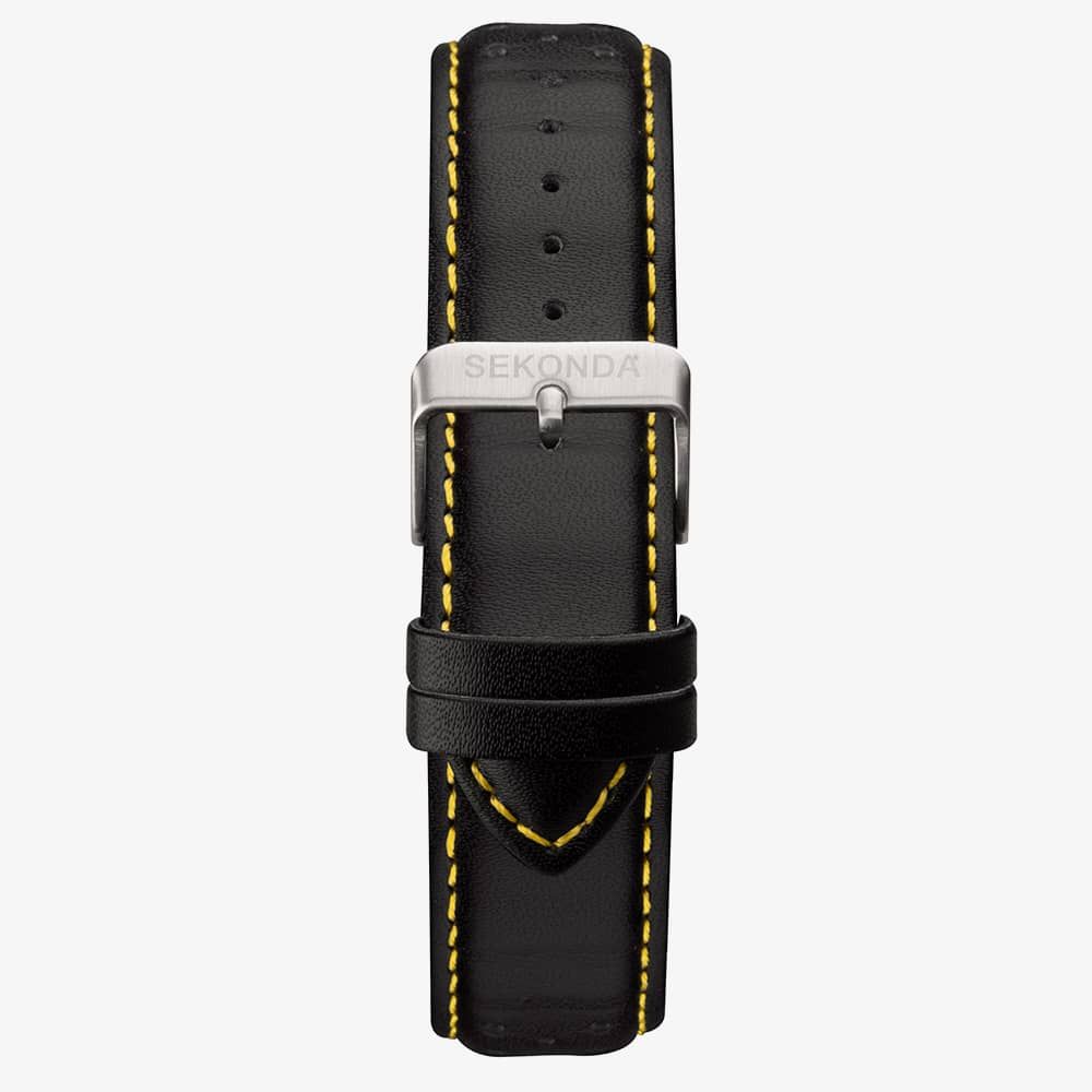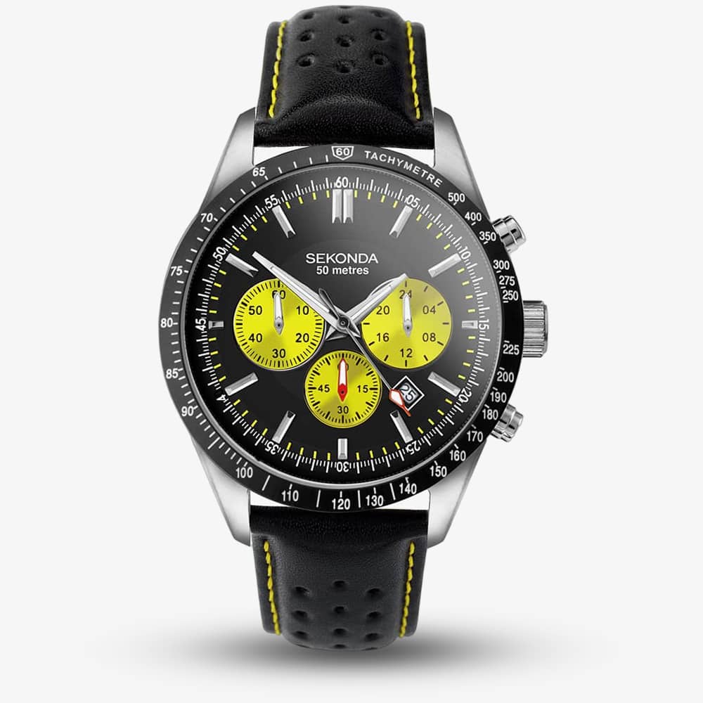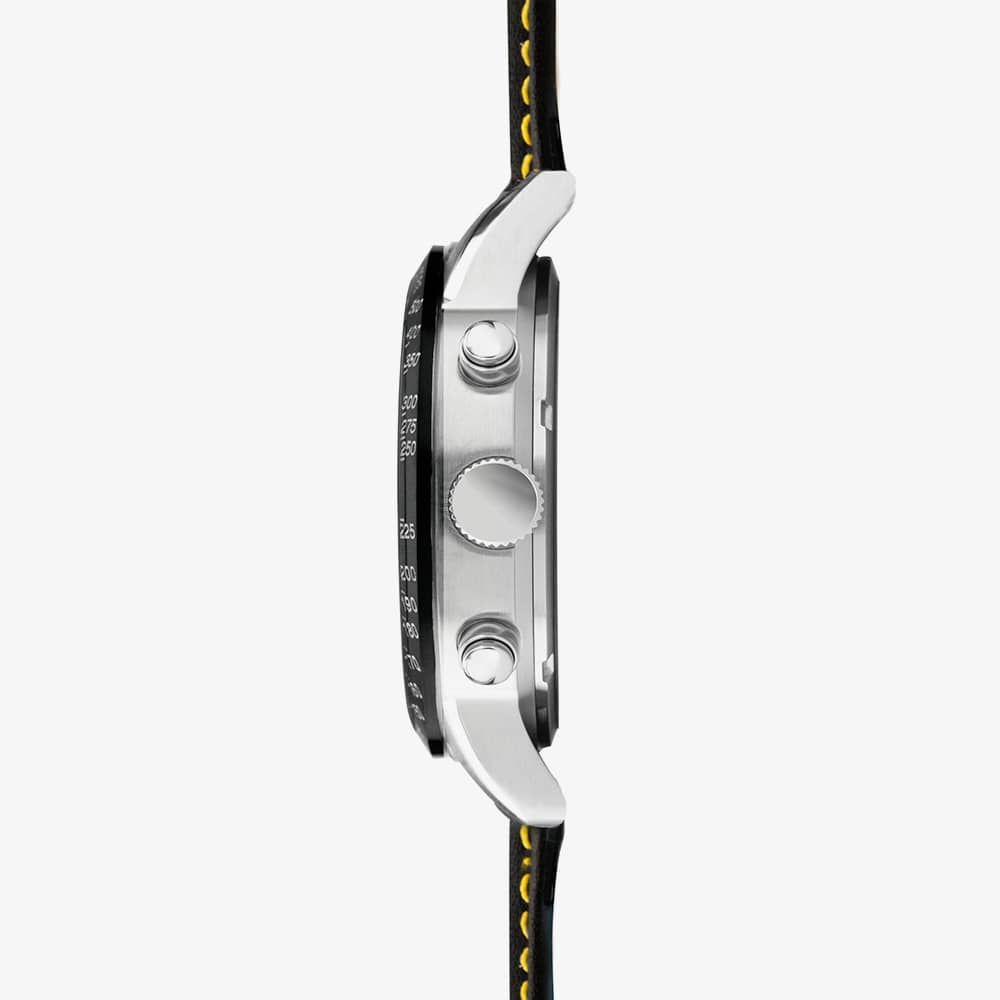 This timepiece features a circular stainless-steel case with a black top ring accentuated by white tachymeter markings. Its black dial hosts vibrant yellow sub-dials. Secured by a black leather strap with yellow stitching.