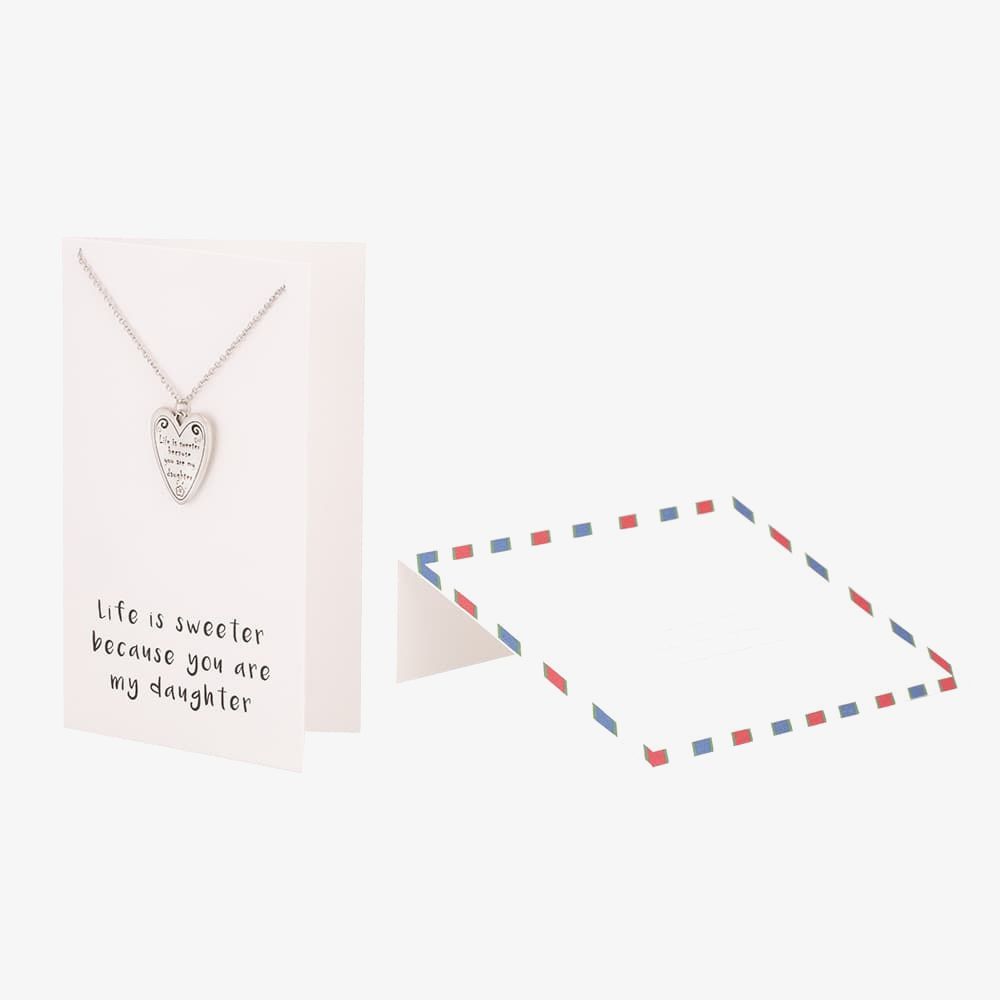 Our families are a big part of our lives, but we often forget to tell them how much they mean to us as we go about our busy lives. Let your loved ones know how you feel by sending a Sentiment. This pretty pendant is engraved with "Life is sweeter because you are my daughter" and comes with a beautiful flower at the bottom.