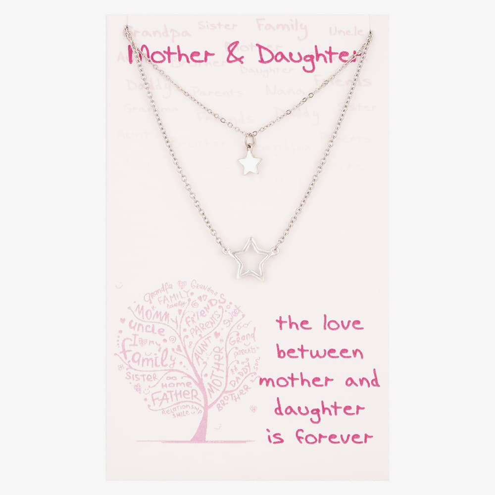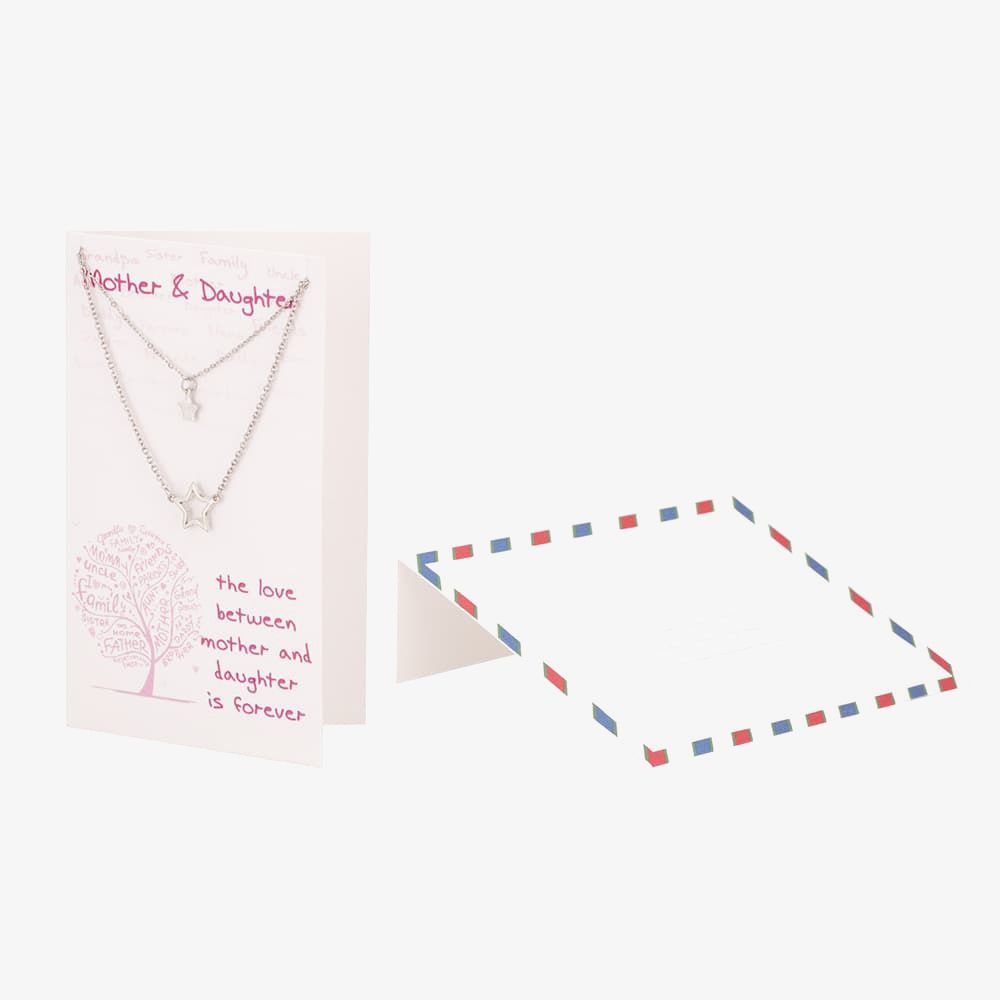 Our families are a big part of our lives, but we often forget to tell them how much they mean to us as we go about our busy lives. Let your loved ones know how you feel by sending a Sentiment. The larger cut-out star necklace will perfectly enclose the small star pendant within its embrace, and the lovely card reads "The love between mother and daughter is forever".