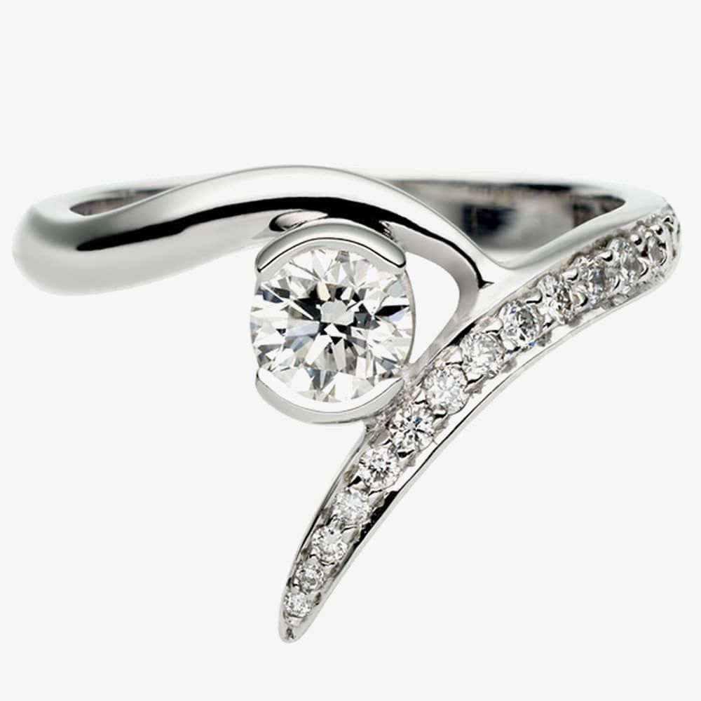 A beautiful piece from the Entwined collection, this outward interlocking Platinum ring has been crafted with a rubover set centre diamond and a claw set diamond interlocking frame. This dazzling ring would make the perfect engagement ring or ideal statement piece as part of a layered stack.