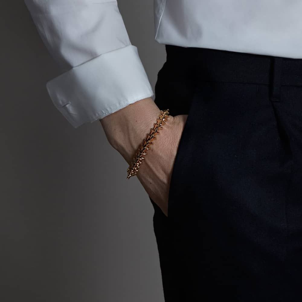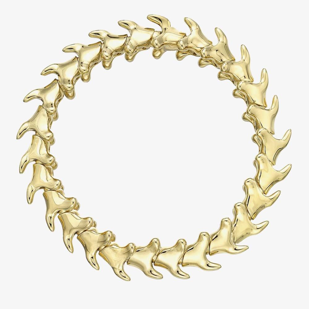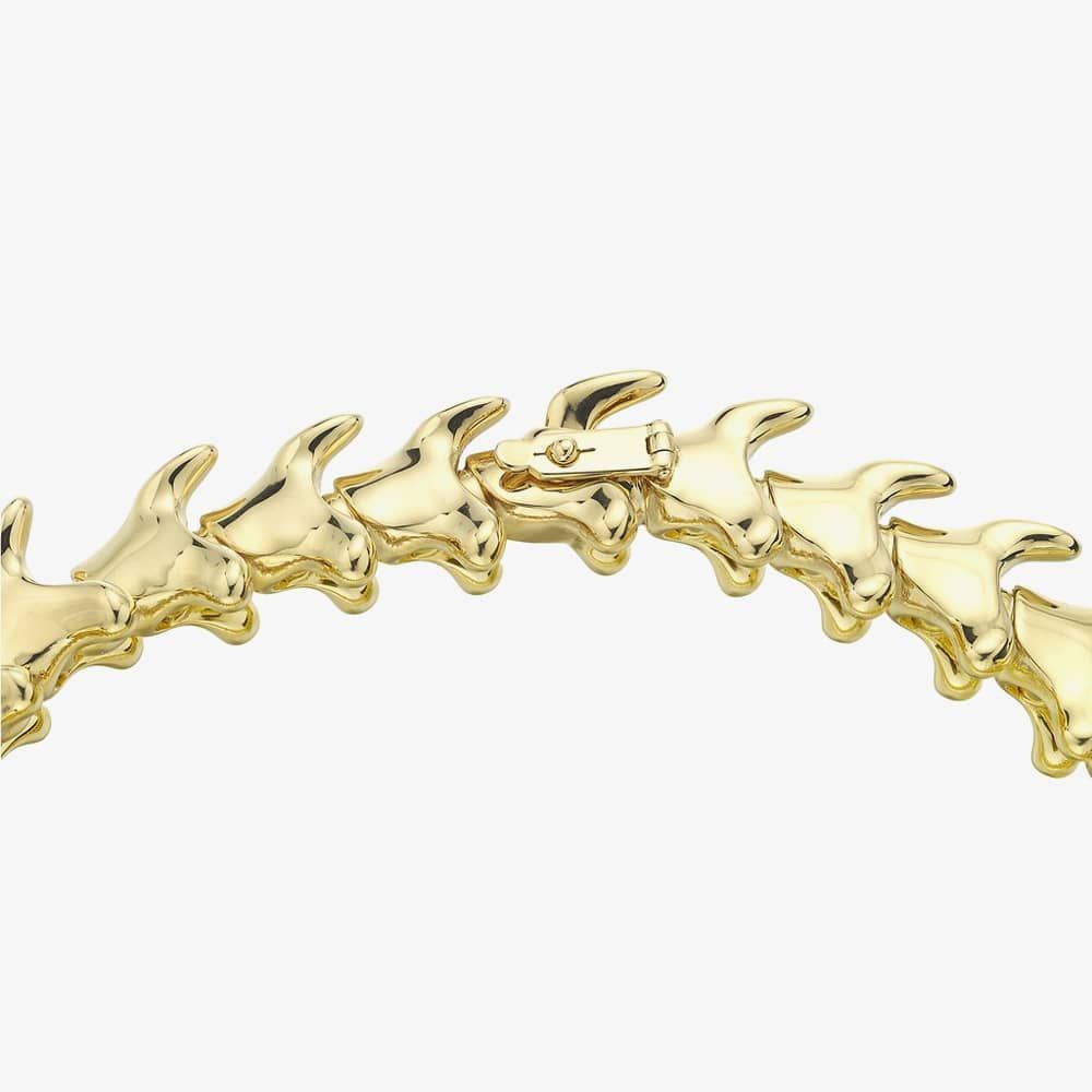 Shaun Leane Serpent's Trace Yellow Gold Vermeil Wide Bracelet ST012.YVNABZS measuring 17.5cm/7inc size small. This warm gold vermeil wide version individually connects to form a subtle silhouette emulating the elegant motion of the serpent’s spine. To open, and close the bracelet, push down on the vertebrae above the safety lock, secure with the catch. Bracelet dimensions: 11mm.
