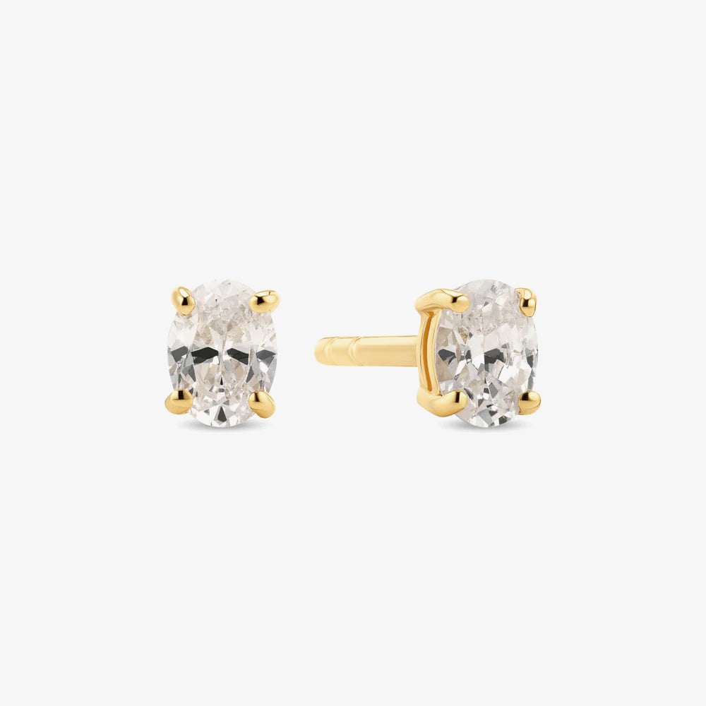These sophisticated stud earrings feature a sleek, elongated oval design crafted from sterling silver and beautifully plated in warm gold. Each elegant oval is pavé-set with dazzling cubic zirconia stones, creating a continuous sparkle that catches the light beautifully with a golden glow.