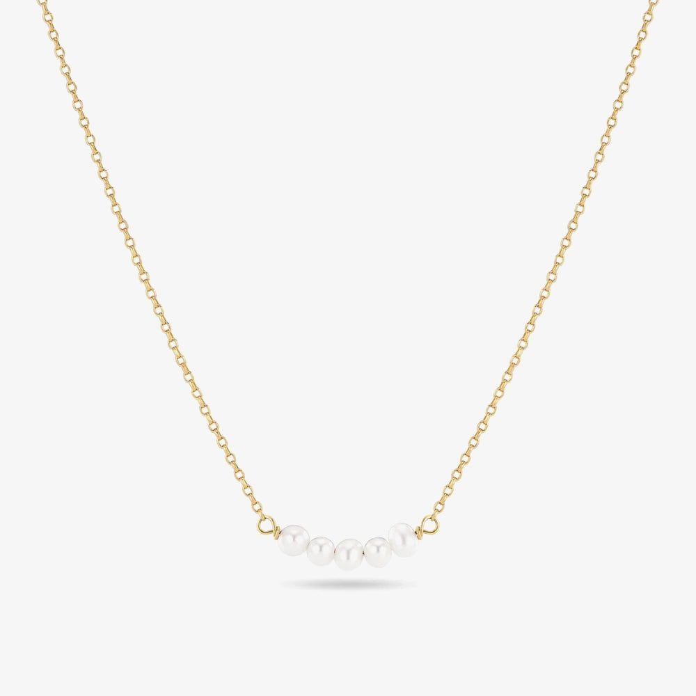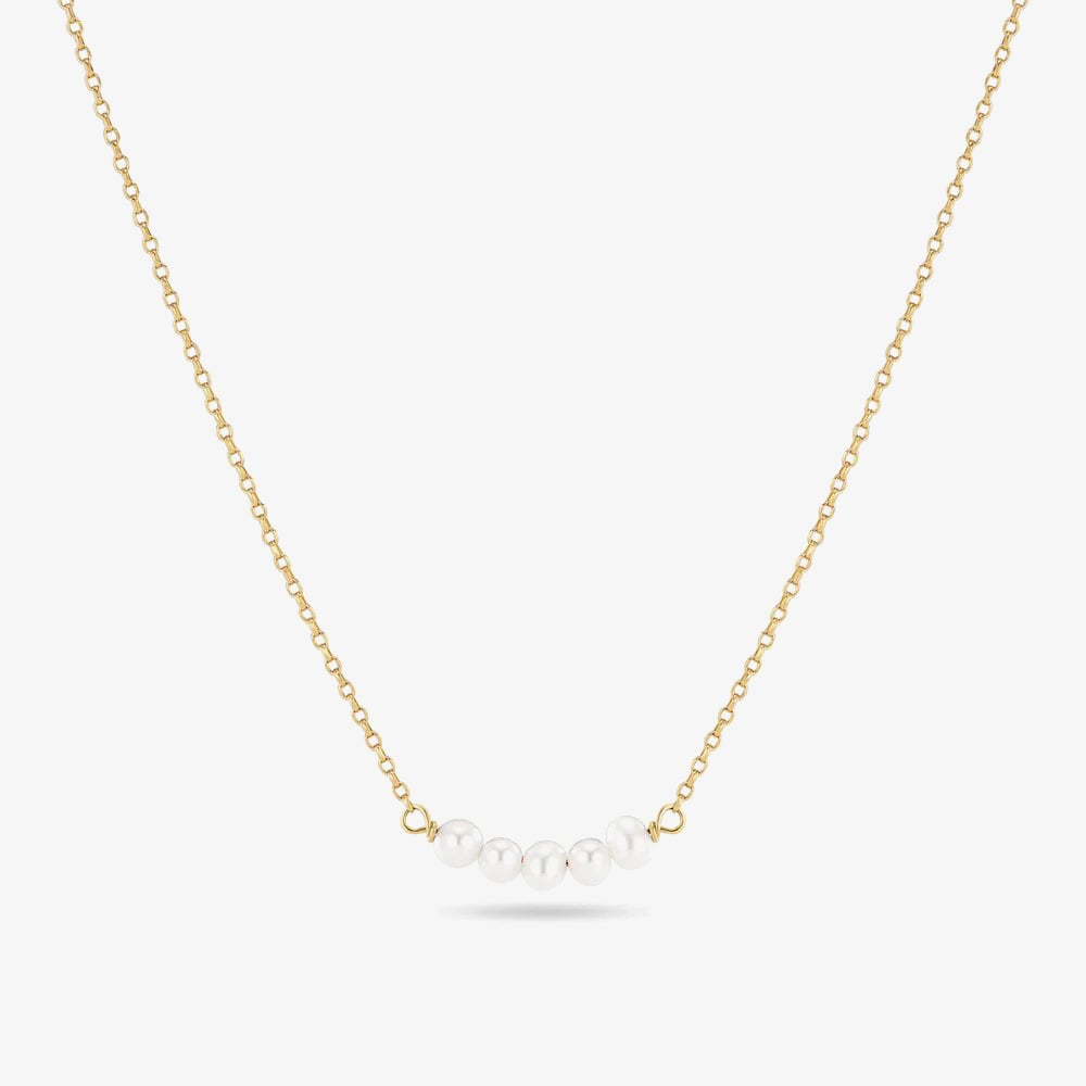 This exquisite necklace features a delicate chain beautifully plated in warm gold, showcasing five lustrous freshwater pearls. Each pearl, with its unique iridescence and organic charm, brings a touch of timeless elegance enhanced by the radiant gold setting. This necklace exudes understated luxury, perfect for adding a touch of grace to any occasion, from everyday to special events.