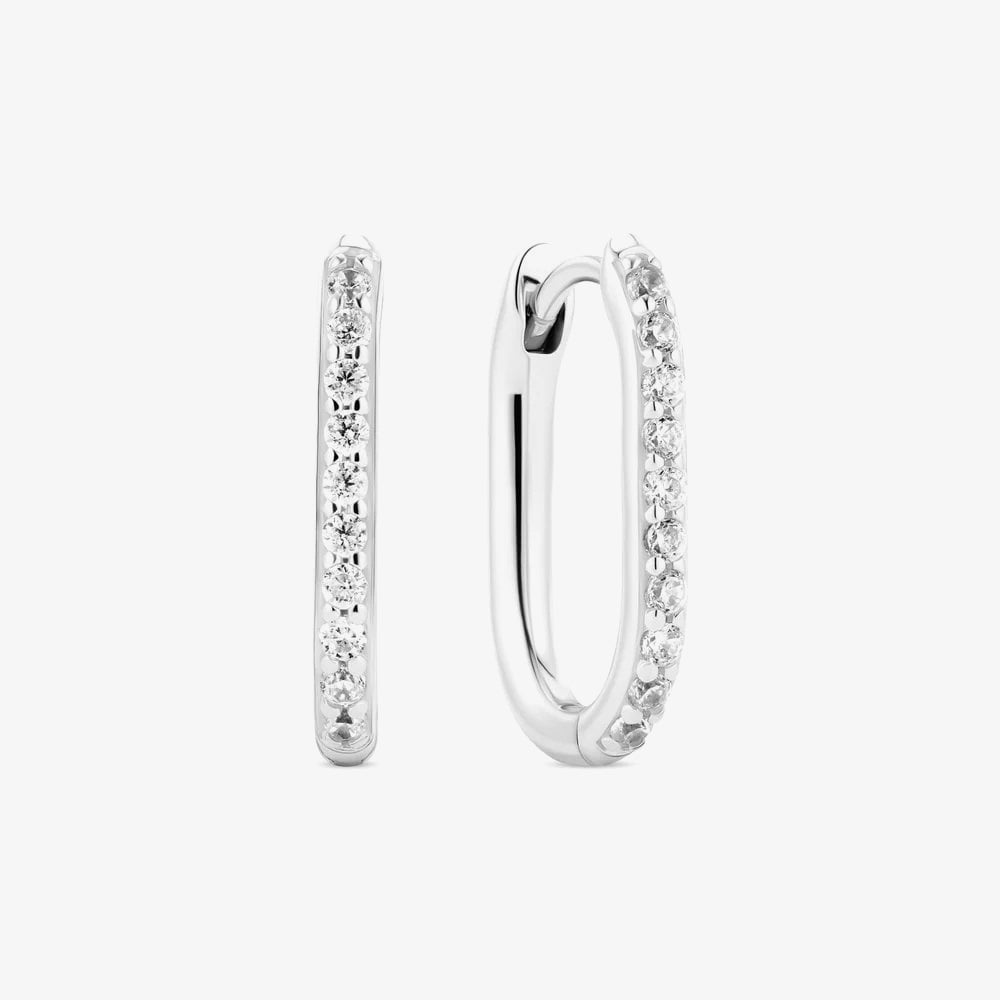 These chic hoop earrings are crafted from polished sterling silver and feature a sleek, flat profile adorned with a row of sparkling cubic zirconia stones. The dazzling stones catch the light with every movement, adding a touch of subtle glamour to the minimalist design. Perfect for adding a touch of refined sparkle to your daily style or a sophisticated shimmer to evening looks.