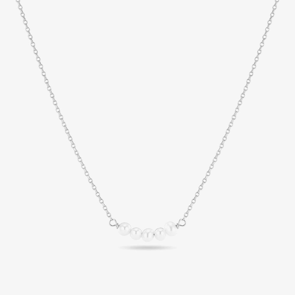 This elegant necklace features a delicate sterling silver chain showcasing five luminous freshwater pearls. Each pearl, with its unique soft glow and organic shape, brings a touch of classic sophistication and natural beauty to the design. This necklace embodies understated luxury, perfect for adding a refined touch to both everyday ensembles and special occasions.