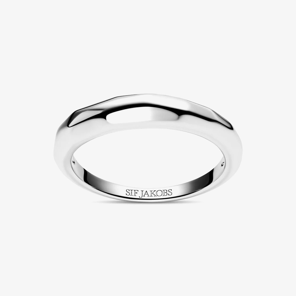 This stylish ring is crafted from polished sterling silver and features a unique, slightly textured surface. This subtle detailing adds a modern and tactile element to the classic band design, catching the light in a delicate and understated way. Perfect for adding a touch of contemporary elegance to your everyday wear.