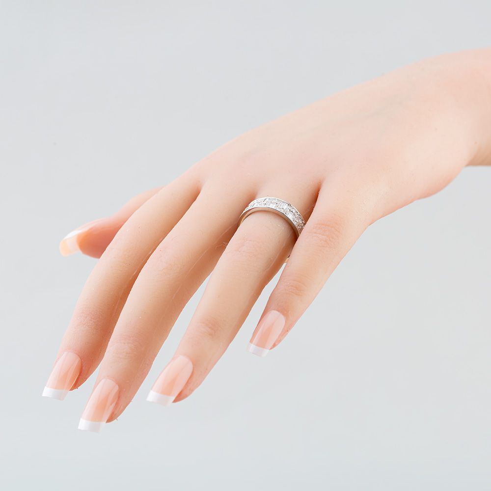 This sterling silver full eternity ring showcases a beautifully patterned band, adorned with alternating brilliant cut and baguette cut cubic zirconia stones. The continuous design of sparkling stones offers a sophisticated and elegant look, making it a perfect choice for symbolizing enduring love and commitment.