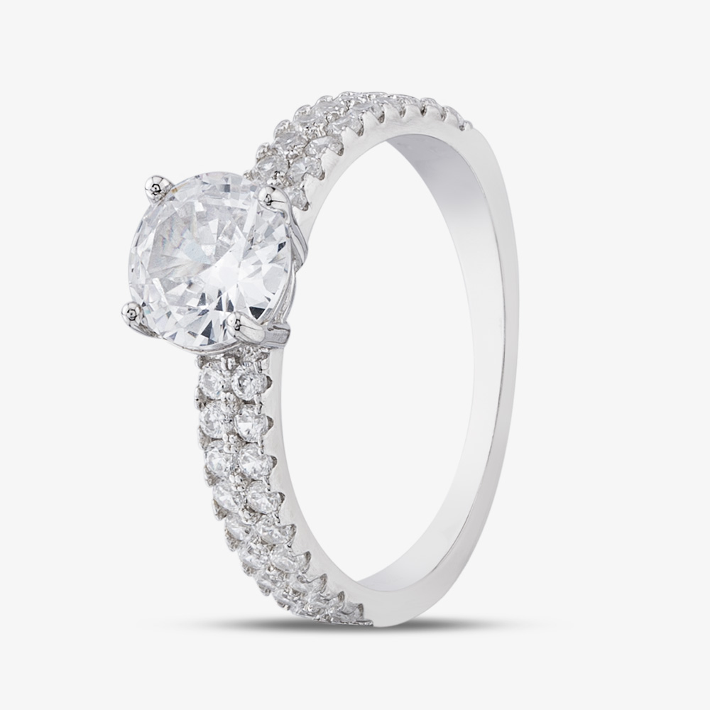 classic sterling silver solitaire ring featuring a brilliant-cut cubic zirconia centrepiece, elegantly accented with shoulder-set stones for added sparkle. Its sleek design makes it a perfect accessory for both everyday wear and special occasions, symbolizing endless beauty and love.