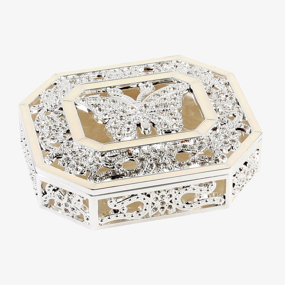 Beautifully designed, this charming trinket box features an elegant butterfly motif, finished in a polished silver tone. Perfect for storing rings, earrings, and small keepsakes.