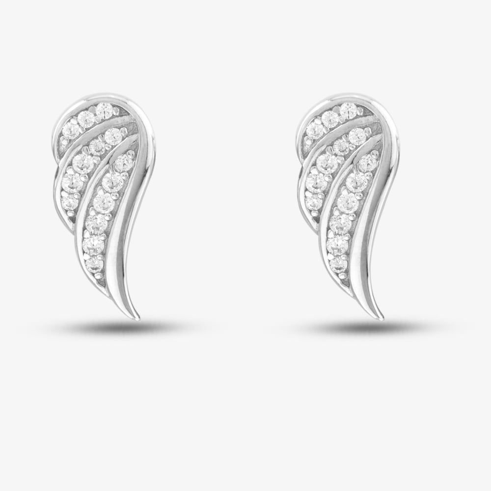 Graceful and radiant, these sterling silver angel wing stud earrings are adorned with sparkling cubic zirconia stones. The intricate wing design combined with the shimmering stones creates a beautiful and meaningful piece, perfect for adding a touch of elegance and charm to any look.