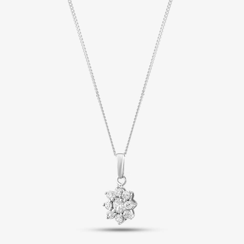 This beautiful sterling silver necklace features a cluster of white cubic zirconia stones in the form of a flower, capturing the essence of elegance and grace.
