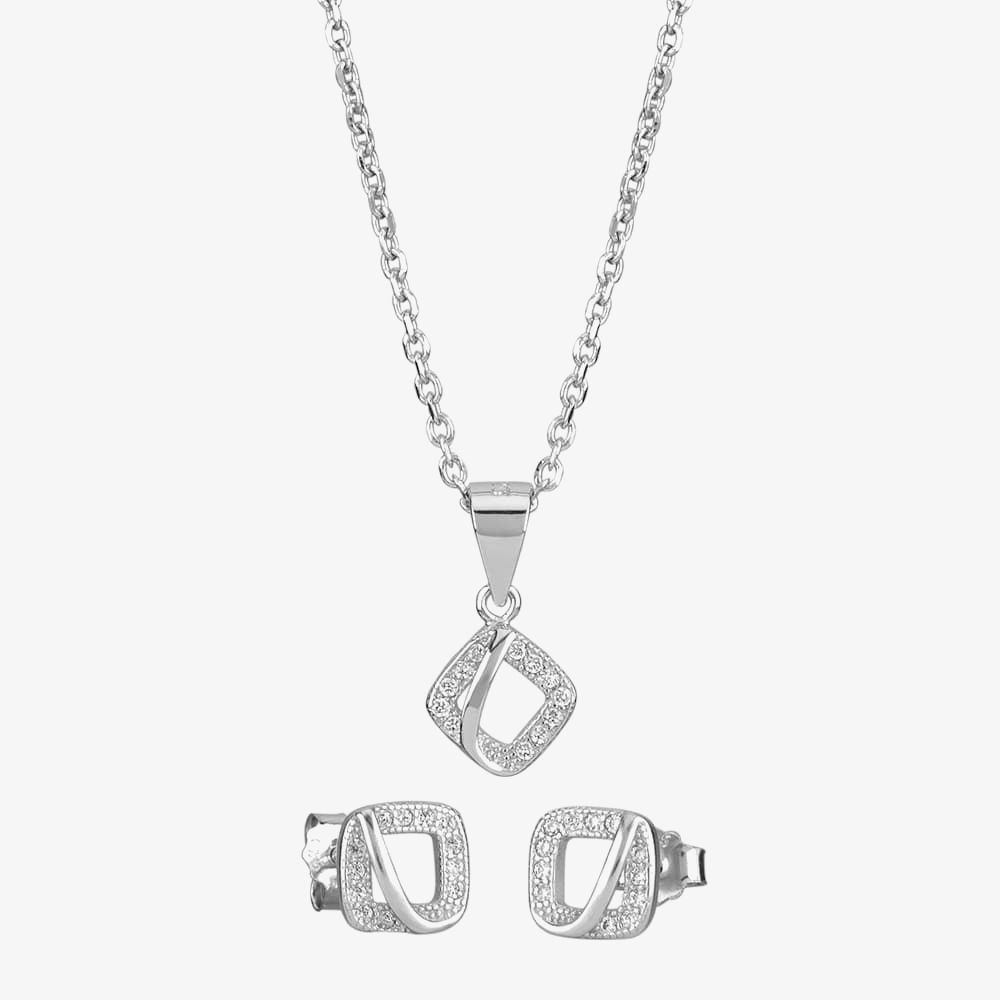 Contemporary meets vintage detail in this shimmering jewellery set. With the outer frame encrusted with cubic zirconia and lines with beaded detailing, an off-centre polished ribbon of silver crosses the open space to curl from one corner to the other.