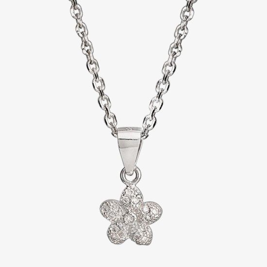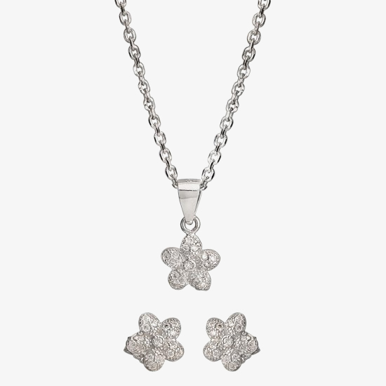 This pretty daisy pendant and earring set combines cubic zirconia Pave with textured detailing and beaded edging to create a faceted piece that will easily catch the light,