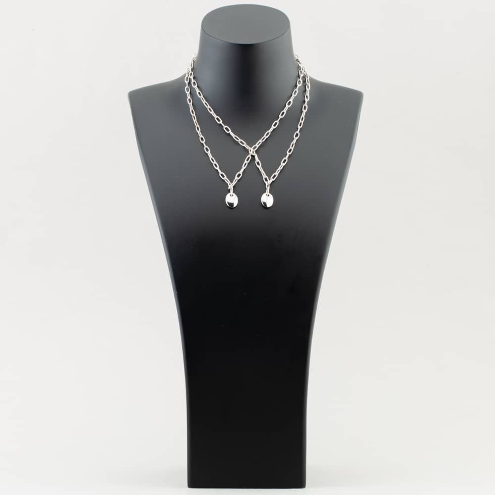 A simple & elegant sterling silver double necklace crafted with two oval disc motifs with a sparkling round rubover set diamond. This layered necklace is completed with oval round belcher chain with a lobster clasp fastening. This versatile necklace looks perfect dressed up or ideal for a more casual look.