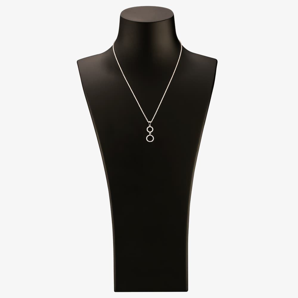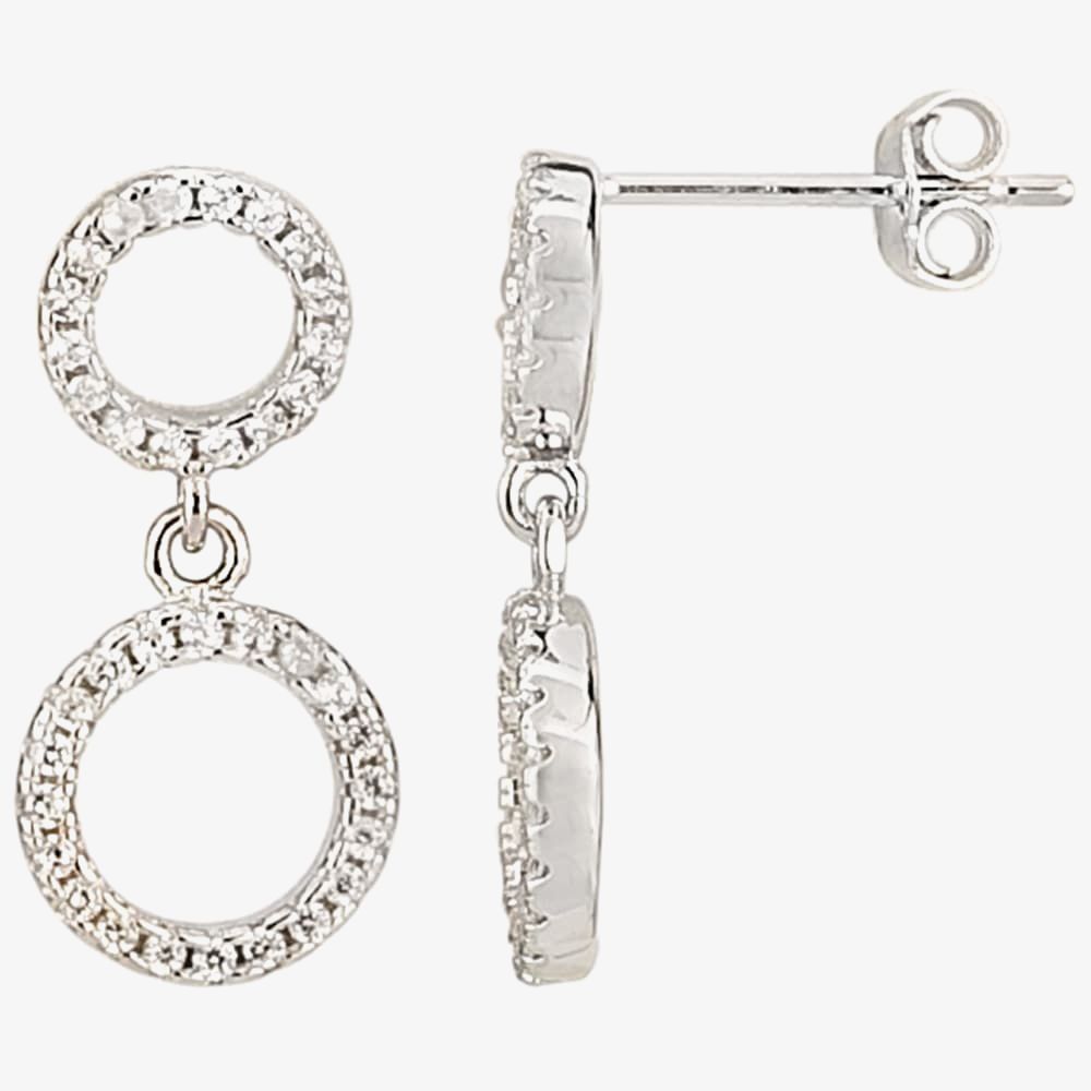 This classic jewellery set combines an open circle design with articulated movement to produce the double halo droppers of the matching pendant and earrings, perfect for adding a subtle shimmer to any outfit