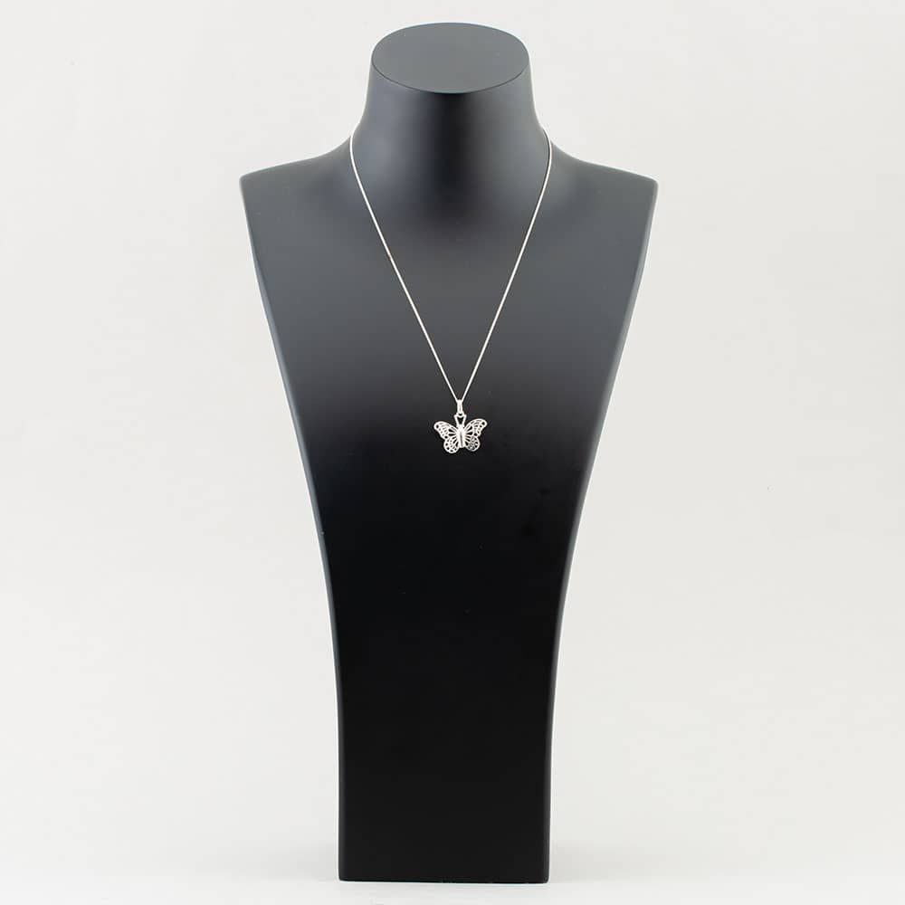 From a sensuous sterling silver chain hangs an expertly crafted filigree pattern butterfly pendant this engrossing piece of silver jewellery whether purchased for yourself or a loved one will create an unforgettable focal point to any outfit! Description of Product: - Sterling Silver Pendant - Butterfly Shape Design