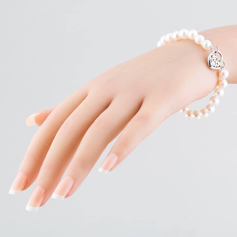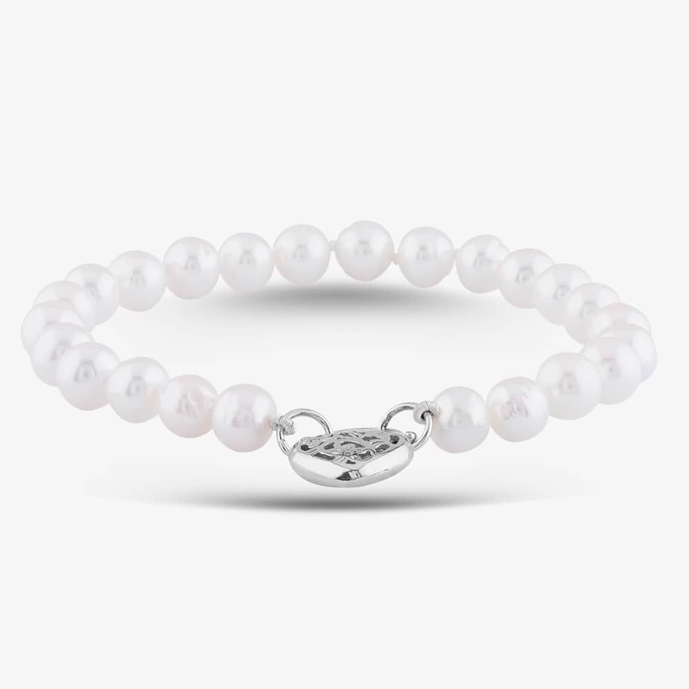 This pretty pearl bracelet features an intricate and detailed heart lock clasp, released by a small discreet lever to one side..