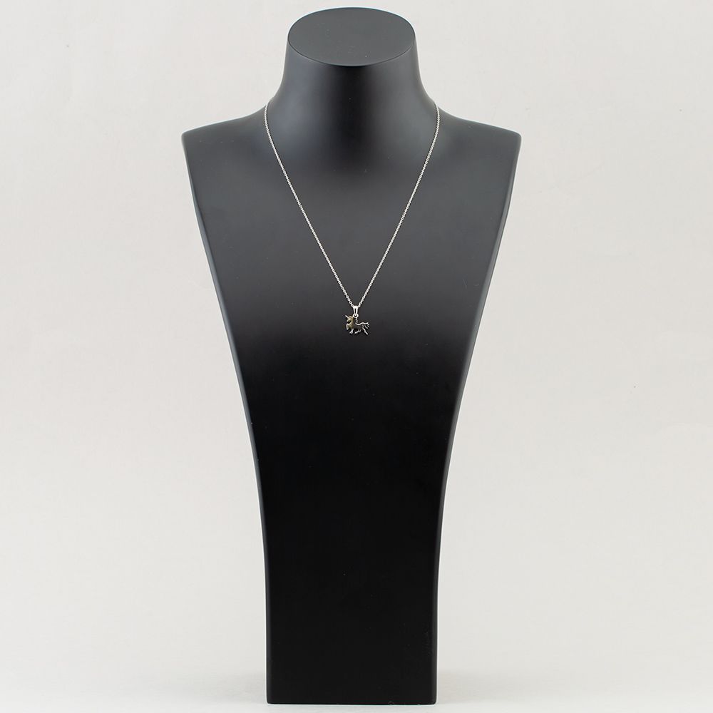 A charming sterling silver necklace featuring a plain unicorn silhouette pendant. Suspended on a delicate trace chain, it’s a whimsical and elegant accessory for any unicorn lover.