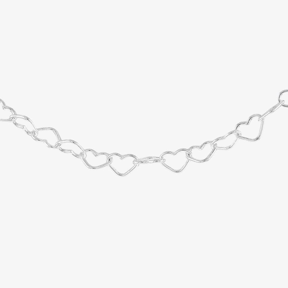 The chain is crafted from sterling silver and secured with a spring ring clasp, providing a secure and easy closure. The polished finish gives it a radiant glow, making it a perfect accessory for layering or wearing on its own. This heart-link chain combines both fancy and minimalistic elements, offering a versatile and stylish option for jewellery lovers.