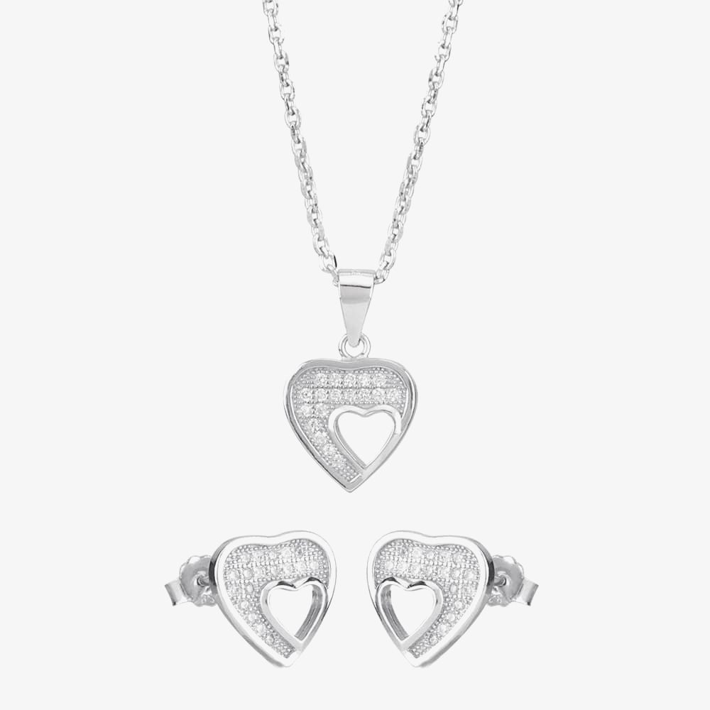 This adorable cut-out heart pendant and earring set will make the perfect gift for a loved one. Beautifully crafted in sterling silver the pendant and earrings feature a small cut-out heart design. Encrusted with white Cubic Zirconia Pave stones, the set will add a hint of sparkle to any occasion.