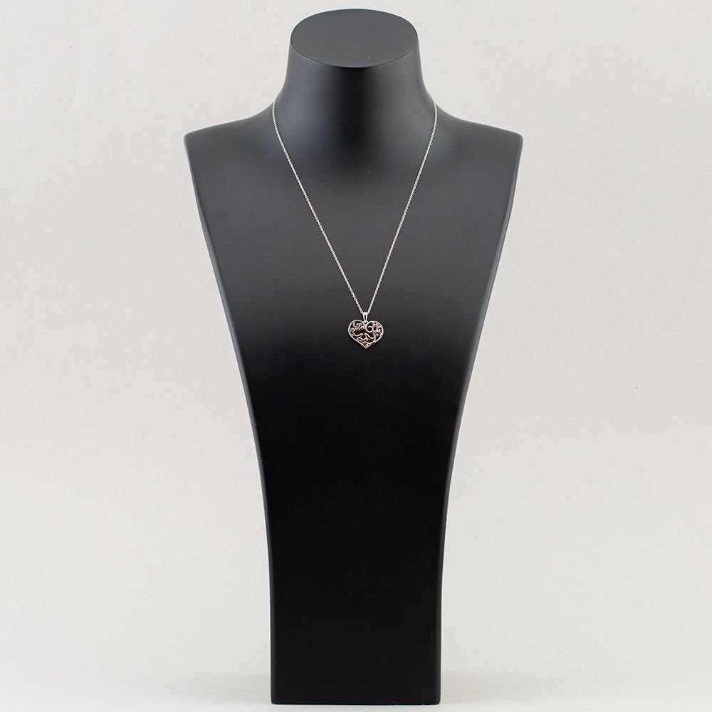 An elegant sterling silver necklace featuring a cut-out patterned heart pendant with exquisite rose gold plating. Suspended on a fine trace chain, it’s a stunning blend of sophistication and charm.