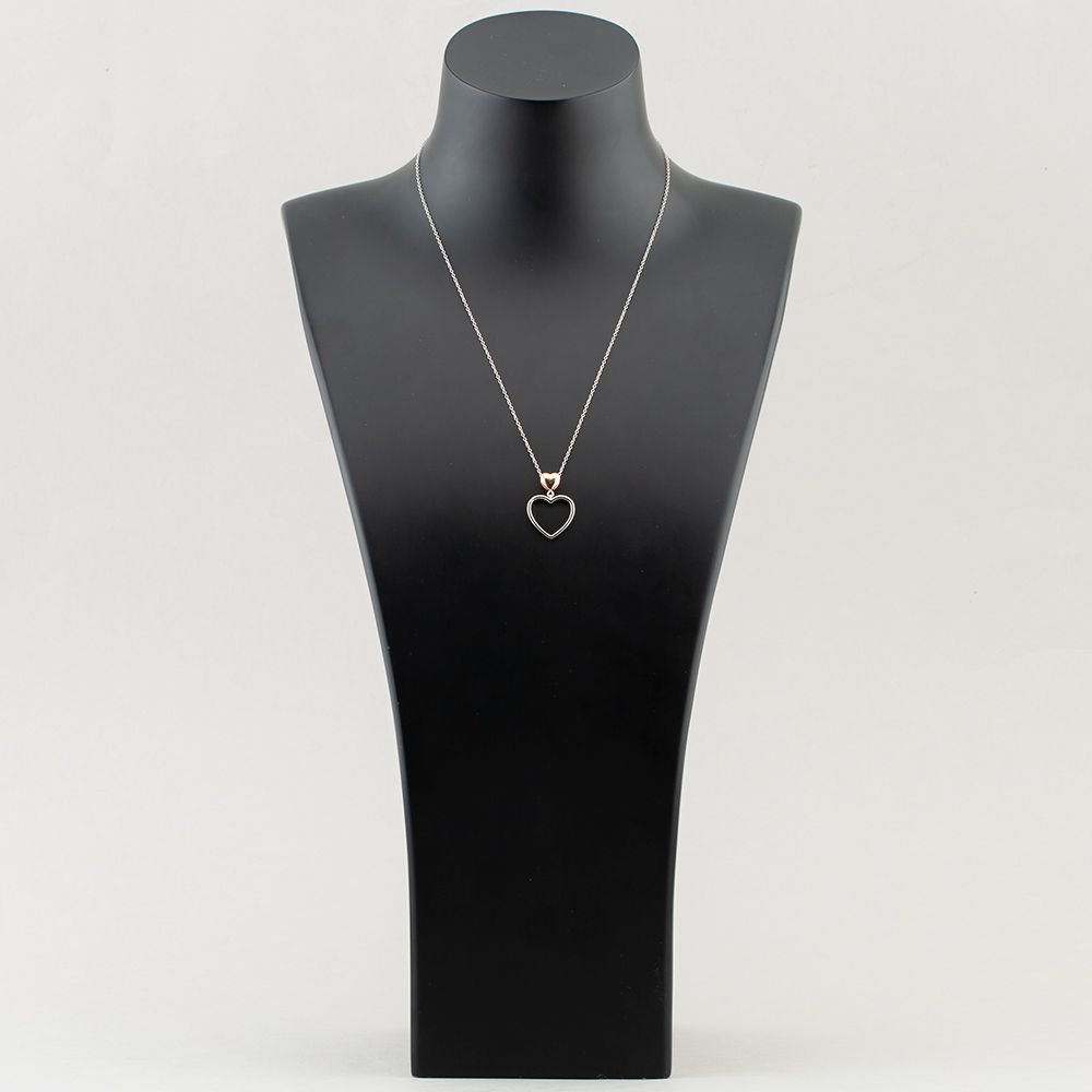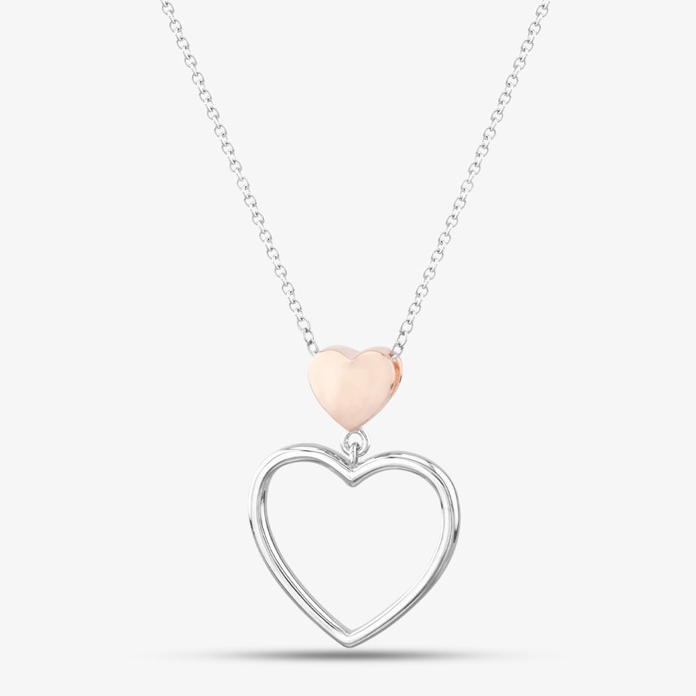 A stylish silver trace chain necklace featuring a two-heart pendant: a smaller rose gold-plated heart delicately placed above a larger open silver heart. This elegant design beautifully combines the warmth of rose gold with the timelessness of silver.
