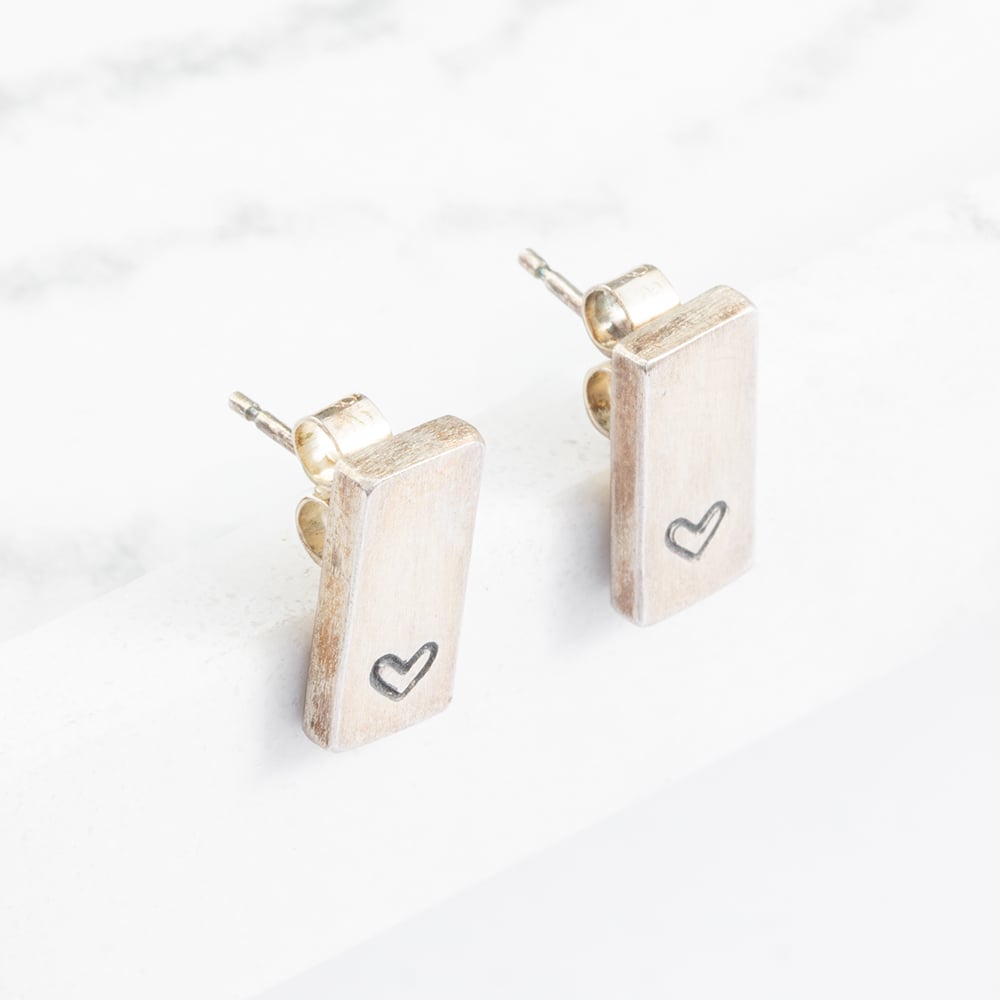 Charming with a touch of edge, these silver-tone rectangle stud earrings feature delicate heart motifs and an oxidised finish for a vintage-inspired look. Their unique design adds subtle character—perfect for everyday wear with a meaningful twist.