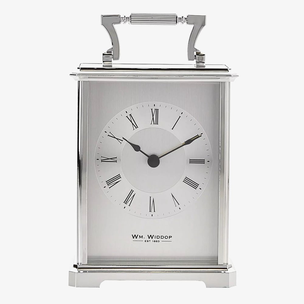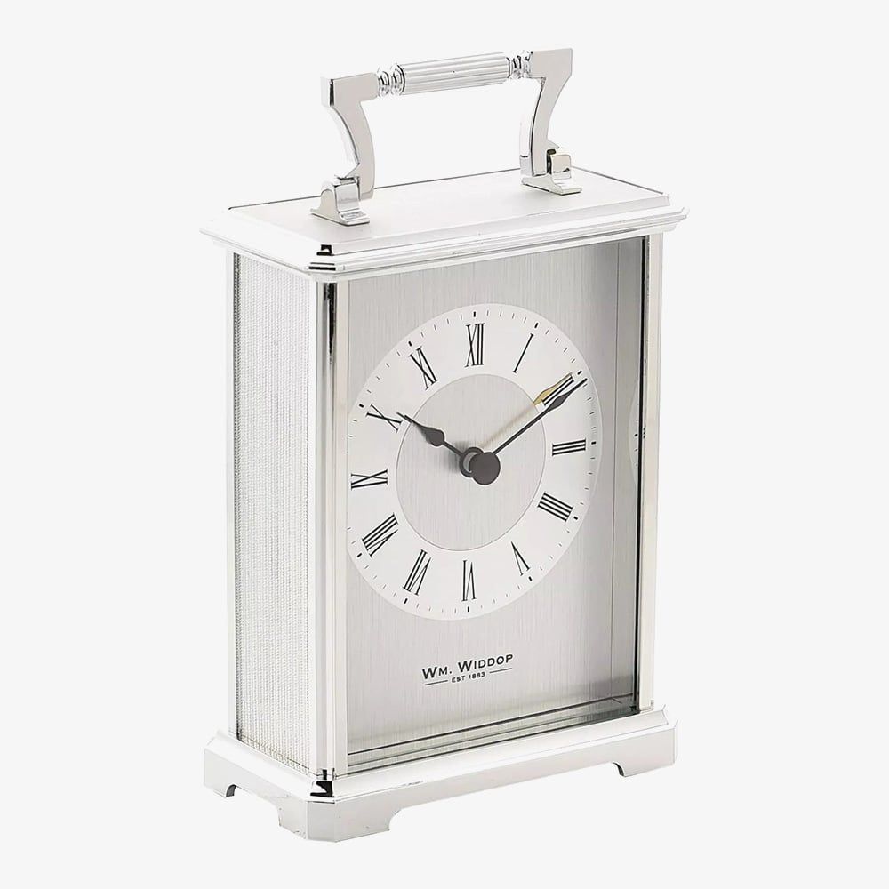 Enhance your home with traditional styling with this silver carriage clock by WM Widdop. Powered by the Quartz movement the clock face features Roman numeral hour markers and fancy black hands. The cool hue of the silver tone plating has a combination of smooth and textured side detailing, making an attractive centrepiece for mantels and bedside tables. Battery operated, not included.