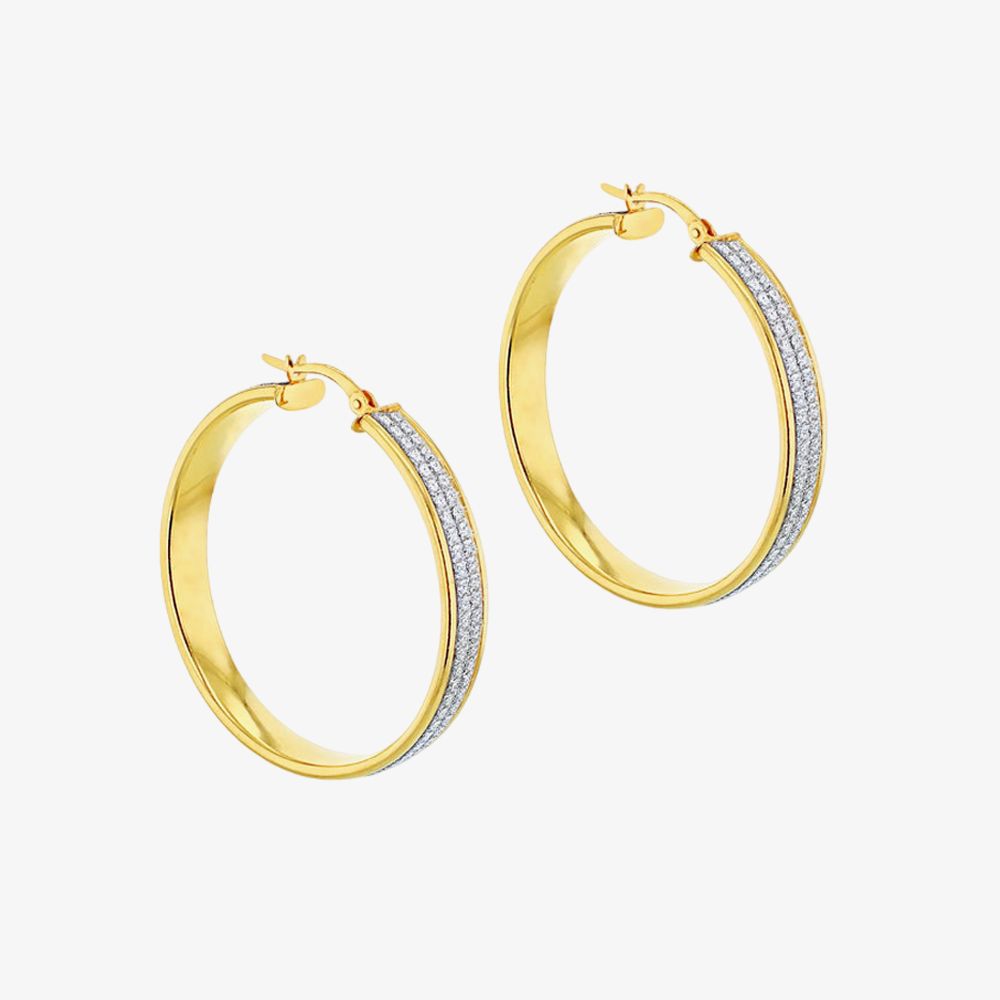 With a stunning blend of elegance and sparkle, these hoop earrings make a stylish statement. The hoops are beautifully gold-plated, featuring stardust stones that catches the light, adding a touch of sophistication. The delicate stardust texture on the outer surface creates a dazzling shimmer, offering a subtle yet eye-catching contrast. Designed with a hinged post for a secure fit, these Creole-style earrings are both comfortable and fashionable. Crafted from sterling silver and finished in radiant yellow gold, they offer a luxurious yet versatile accessory, perfect for both everyday wear and special occasions.