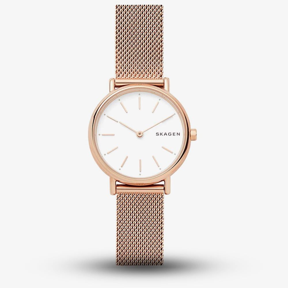 Created in stainless steel with a glistening rose gold plating, this stunning timepiece from Skagen will add a stylish finish to your everyday look. The Signatur timepiece features a crisp white dial that is set with rose gold plated hour markers and hands. The piece is finished with an adjustable and interchangeable mesh strap.